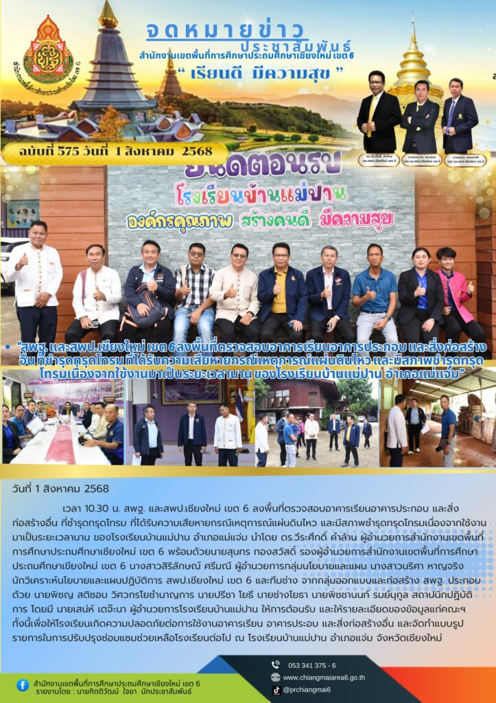 “สพฐ. และสพป.เชียงใหม่ เขต 6 ลงพื้นที่ตรวจสอบอาคารเรียนอาคารประกอบ และสิ่งก่อสร้างอื่น ที่ชำรุด ทรุดโทรม ที่ได้รับความเสียหายกรณีเหตุการณ์แผ่นดินไหว และมีสภาพชำรุดทรุดโทรมเนื่องจากใช้งานมาเป็นระยะเวลานาน ของโรงเรียนบ้านแม่ปาน อำเภอแม่แจ่ม”