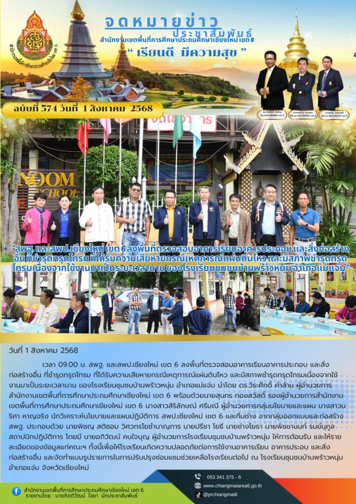 วันที่ 1 สิงหาคม 2568 เวลา 09.00 น. สพฐ. และสพป.เชียงใหม่ เขต 6 ลงพื้นที่ตรวจสอบอาคารเรียนอาคารประกอบ และสิ่งก่อสร้างอื่น ที่ชำรุดทรุดโทรม ที่ได้รับความเสียหายกรณีเหตุการณ์แผ่นดินไหว และมีสภาพชำรุดทรุดโทรมเนื่องจากใช้งานมาเป็นระยะเวลานาน ของโรงเรียนชุมชนบ้านพร้าวหนุ่ม อำเภอแม่แจ่ม นำโดย ดร.วีระศึกดิ์ คำล้าน ผู้อำนวยการสำนักงานเขตพื้นที่การศึกษาประถมศึกษาเชียงใหม่ เขต 6 พร้อมด้วยนายสุนทร ทองสวัสดิ์ รองผู้อำนวยการสำนักงานเขตพื้นที่การศึกษาประถมศึกษาเขียงใหม่ เขต 6 นางสาวสิริลักษณ์ ศรีมณี ผู้อำนวยการกลุ่มนโยบายและแผน นางสาวนริศา หาญจริง นักวิเคราะห์นโยบายและแผนปฏิบัติการ สพป.เชียงใหม่ เขต 6 และทีมช่าง จากกลุ่มออกแบบและก่อสร้าง สพฐ. ประกอบด้วย นายพิชญ สติชอบ วิศวกรโยชำนาญการ นายปรีชา โยธี นายช่างโยธา นายพิชชานนท์ รมย์นุกูล สถาปนิกปฏิบัติการ โดยมี นายอภิวัฒน์ คนใจบุญ ผู้อำนวยการโรงเรียนชุมชนบ้านพร้าวหนุ่ม ให้การต้อนรับ และให้รายละเอียดของข้อมูลแก่คณะฯ ทั้งนี้เพื่อให้โรงเรียนเกิดความปลอดภัยต่อการใช้งานอาคารเรียน อาคารประอบ และสิ่งก่อสร้างอื่น และจัดทำแบบรูปรายการในการปรับปรุงซ่อมแซมช่วยเหลือโรงเรียนต่อไป ณ โรงเรียนชุมชนบ้านพร้าวหนุ่ม อำเภอแจ่ม จังหวัดเชียงใหม่