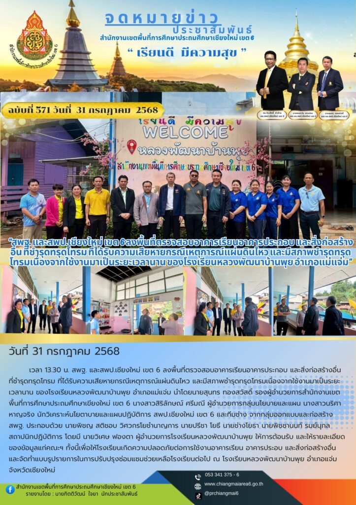 สพฐ. และสพป.เชียงใหม่ เขต 6 ลงพื้นที่ตรวจสอบอาคารเรียนอาคารประกอบ และสิ่งก่อสร้างอื่น ที่ชำรุดทรุดโทรม ที่ได้รับความเสียหายกรณีเหตุการณ์แผ่นดินไหว และมีสภาพชำรุดทรุดโทรมเนื่องจากใช้งานมาเป็นระยะเวลานาน ของโรงเรียนหลวงพัฒนาบ้านพุย อำเภอแม่แจ่ม นำโดยนายสุนทร ทองสวัสดิ์ รองผู้อำนวยการสำนักงานเขตพื้นที่ การศึกษาประถมศึกษาเขียงใหม่ เขต 6 นางสาวสิริลักษณ์ ศรีมณี ผู้อำนวยการกลุ่มนโยบายและแผน นางสาวนริศา หาญจริง นักวิเคราะห์นโยบายและแผนปฏิบัติการ สพป.เชียงใหม่ เขต 6 และทีมช่าง จากกลุ่มออกแบบและก่อสร้าง สพฐ. ประกอบด้วย นายพิชญ สติชอบ วิศวกรโยชำนาญการ นายปรีชา โยธี นายช่างโยธา นายพิชชานนท์ รมย์นุกูล สถาปนิกปฏิบัติการ โดยมี นายวิเศษ ฟองตา ผู้อำนวยการโรงเรียนหลวงพัฒนาบ้านพุย ให้การต้อนรับ และให้รายละเอียดของข้อมูลแก่คณะฯ ทั้งนี้เพื่อให้โรงเรียนเกิดความปลอดภัยต่อการใช้งานอาคารเรียน อาคารประอบ และสิ่งก่อสร้างอื่น และจัดทำแบบรูปรายการในการปรับปรุงซ่อมแซมช่วยเหลือโรงเรียนต่อไป ณ โรงเรียนหลวงพัฒนาบ้านพุย อำเภอแจ่ม จังหวัดเชียงใหม่