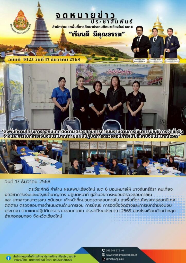 วันที่ 17 ธันวาคม 2568 ดร.วีระศักดิ์ คำล้าน ผู้อำนวยการสำนักงานเขตพื้นที่การศึกษาประถมศึกษาเชียงใหม่เขต 6 ได้มอบหมายให้ หน่วยตรวจสอบภายในดำเนินการติดตาม ตรวจสอบและประเมินการปฏิบัติงานด้านการเงิน การบัญชี ของสถานศึกษาในสังกัด ตามแผนการตรวจสอบภายใน ประจำปีงบประมาณ 2569 ณ โรงเรียนบ้านท่าหลุก อำเภอจอมทอง จังหวัดเชียงใหม่