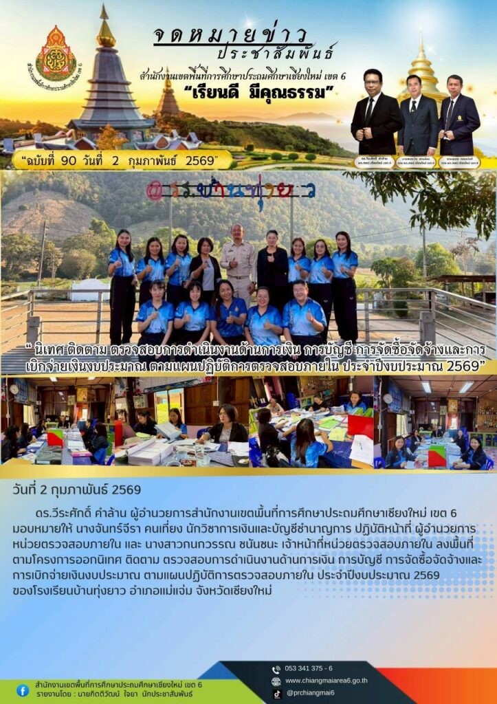 วันที่ 2 กุมภาพันธ์ 2569 ดร.วีระศักดิ์ คำล้าน ผู้อำนวยการสำนักงานเขตพื้นที่การศึกษาประถมศึกษาเชียงใหม่เขต 6 ได้มอบหมายให้ หน่วยตรวจสอบภายในดำเนินการติดตาม ตรวจสอบและประเมินการปฏิบัติงานด้านการเงิน การบัญชี ของสถานศึกษาในสังกัด ตามแผนการตรวจสอบภายใน ประจำปีงบประมาณ 2569 ณ โรงเรียนบ้านทุ่งยาว อำเภอแม่แจ่ม จังหวัดเชียงใหม่