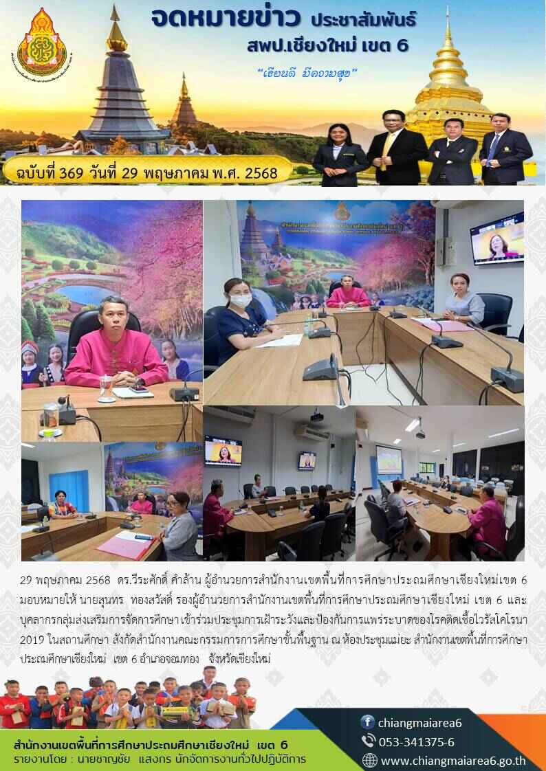 29 พฤษภาคม 2568 ดร.วีระศักดิ์ คำล้าน ผู้อำนวยการสำนักงานเขตพื้นที่การศึกษาประถมศึกษาเชียงใหม่เขต 6 มอบหมายให้ นายสุนทร ทองสวัสดิ์ รองผู้อำนวยการสำนักงานเขตพื้นที่การศึกษาประถมศึกษาเชียงใหม่ เขต 6 และ บุคลากรกลุ่มส่งเสริมการจัดการศึกษา เข้าร่วมประชุมการเฝ้าระวังและป้องกันการแพร่ระบาดของโรคติดเชื้อไวรัสโคโรนา 2019 ในสถานศึกษา สังกัดสำนักงานคณะกรรมการการศึกษาขั้นพื้นฐาน ณ ห้องประชุมแม่ยะ สำนักงานเขตพื้นที่การศึกษาประถมศึกษาเชียงใหม่ เขต 6 อำเภอจอมทอง จังหวัดเชียงใหม่