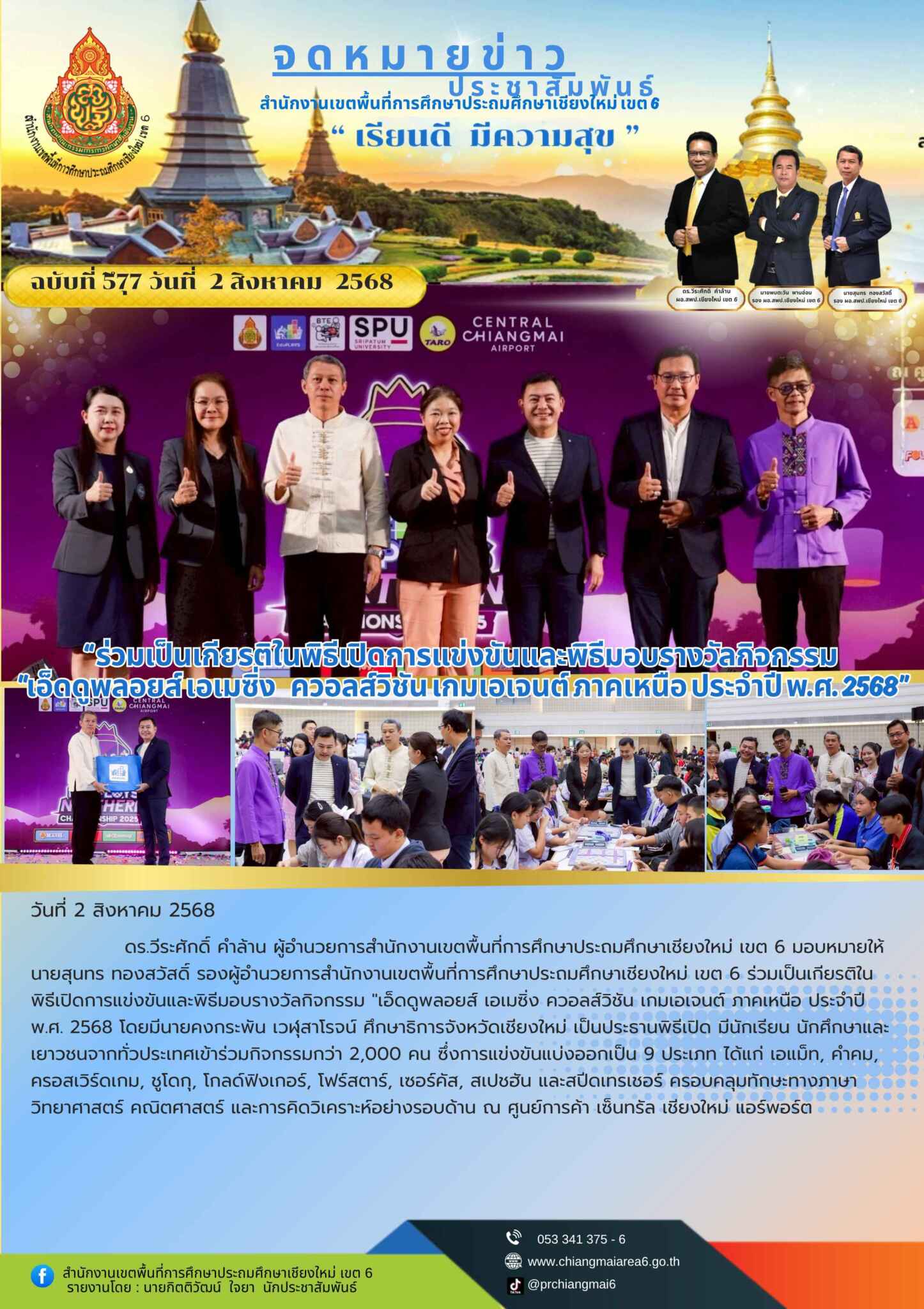 วันที่ 2 สิงหาคม 2568 ดร.วีระศักดิ์ คำล้าน ผู้อำนวยการสำนักงานเขตพื้นที่การศึกษาประถมศึกษาเชียงใหม่ เขต 6 มอบหมายให้นายสุนทร ทองสวัสดิ์ รองผู้อำนวยการสำนักงานเขตพื้นที่การศึกษาประถมศึกษาเชียงใหม่ เขต 6 ร่วมเป็นเกียรติในพิธีเปิดการแข่งขันและพิธีมอบรางวัลกิจกรรม “เอ็ดดูพลอยส์ เอเมซิ่ง ควอลส์วิชัน เกมเอเจนต์ ภาคเหนือ ประจำปี พ.ศ. 2568 โดยมีนายคงกระพัน เวฬุสาโรจน์ ศึกษาธิการจังหวัดเชียงใหม่ เป็นประธานพิธีเปิด มีนักเรียน นักศึกษาและเยาวชนจากทั่วประเทศเข้าร่วมกิจกรรมกว่า 2,000 คน ซึ่งการแข่งขันแบ่งออกเป็น 9 ประเภท ได้แก่ เอแม็ท, คำคม, ครอสเวิร์ดเกม, ชูโดกุ, โกลด์ฟิงเกอร์, โฟร์สตาร์, เซอร์คัส, สเปชฮัน และสปีดเทรเชอร์ ครอบคลุมทักษะทางภาษา วิทยาศาสตร์ คณิตศาสตร์ และการคิดวิเคราะห์อย่างรอบด้าน ณ ศูนย์การค้า เซ็นทรัล เชียงใหม่ แอร์พอร์ต