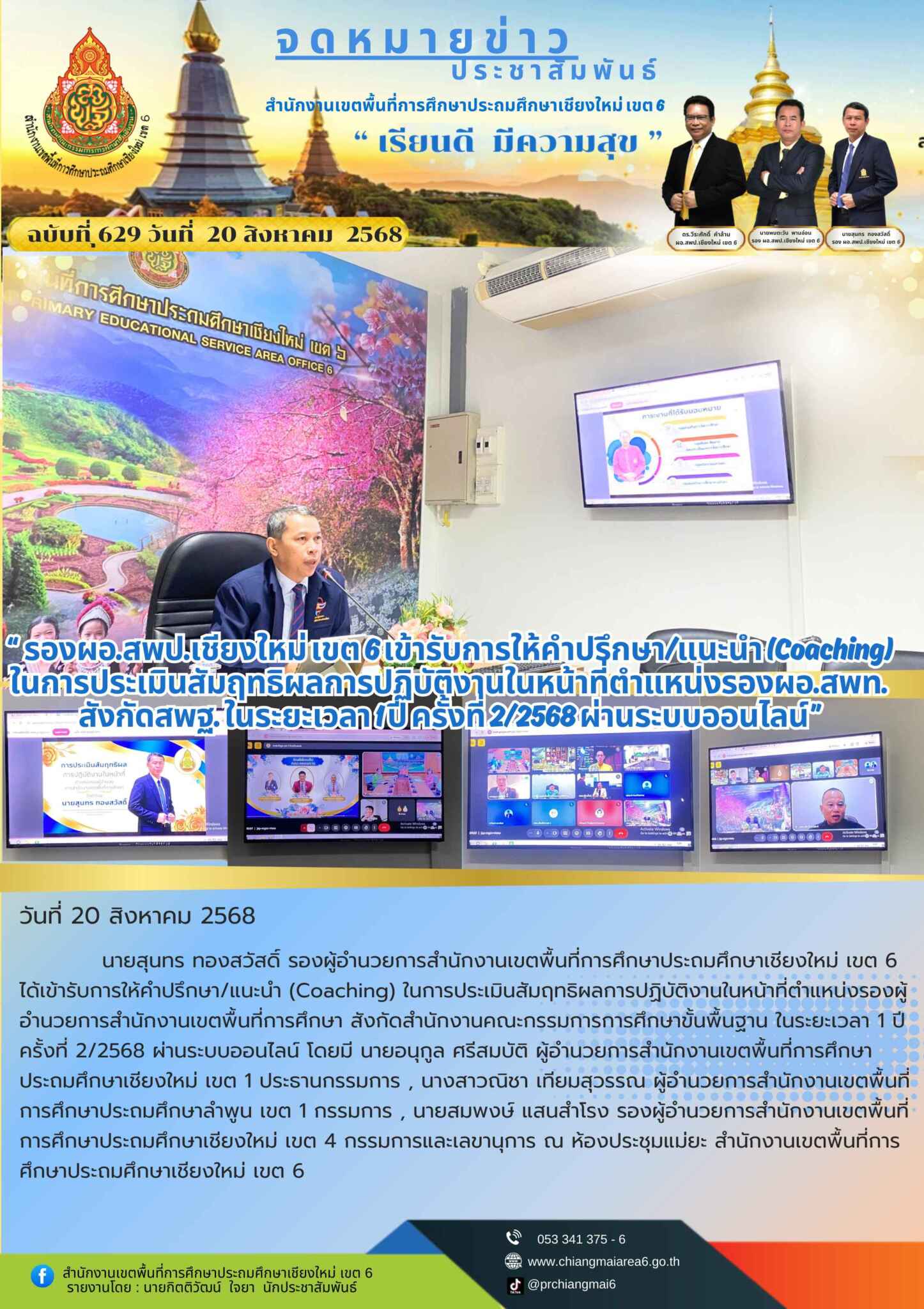 วันที่ 20 สิงหาคม 2568 นายสุนทร ทองสวัสดิ์ รองผู้อำนวยการสำนักงานเขตพื้นที่การศึกษาประถมศึกษาเชียงใหม่ เขต 6 ได้เข้ารับการให้คำปรึกษา/แนะนำ (Coaching) ในการประเมินสัมฤทธิผลการปฏิบัติงานในหน้าที่ตำแหน่งรองผู้อำนวยการสำนักงานเขตพื้นที่การศึกษา สังกัดสำนักงานคณะกรรมการการศึกษาขั้นพื้นฐาน ในระยะเวลา 1 ปี ครั้งที่ 2/2568 ผ่านระบบออนไลน์ โดยมี นายอนุกูล ศรีสมบัติ ผู้อำนวยการสำนักงานเขตพื้นที่การศึกษาประถมศึกษาเชียงใหม่ เขต 1 ประธานกรรมการ , นางสาวณิชา เทียมสุวรรณ ผู้อำนวยการสำนักงานเขตพื้นที่การศึกษาประถมศึกษาลำพูน เขต 1 กรรมการ , นายสมพงษ์ แสนสำโรง รองผู้อำนวยการสำนักงานเขตพื้นที่การศึกษาประถมศึกษาเชียงใหม่ เขต 4 กรรมการและเลขานุการ ณ ห้องประชุมแม่ยะ สำนักงานเขตพื้นที่การศึกษาประถมศึกษาเชียงใหม่ เขต 6