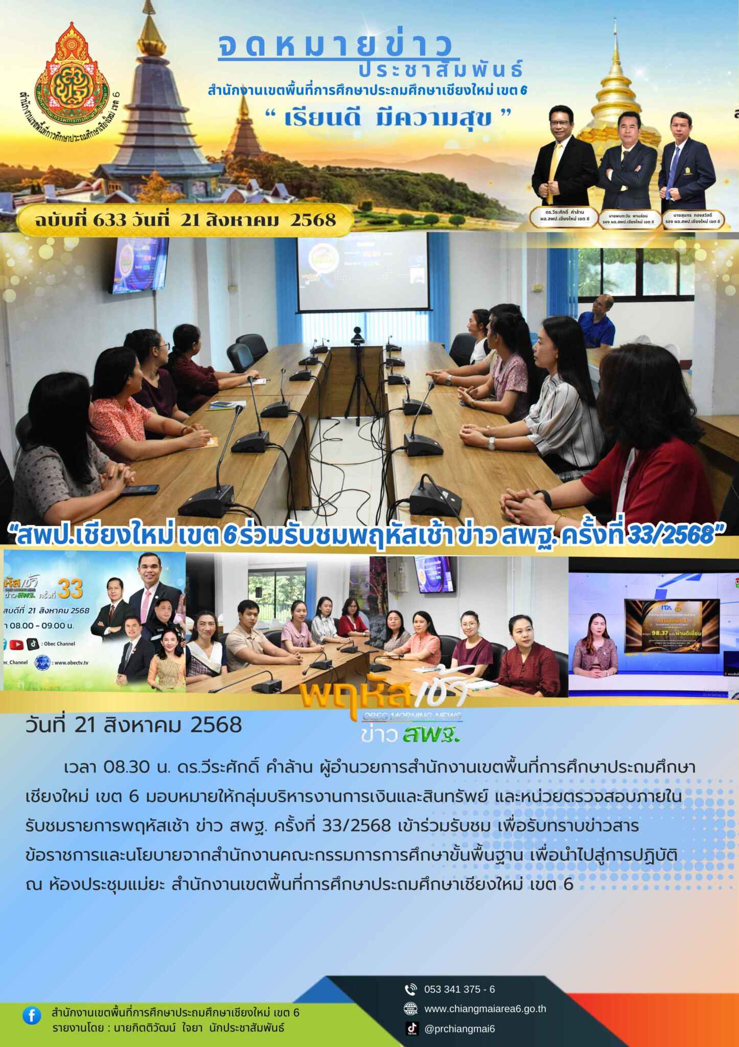 เวลา 08.30 น. ดร.วีระศักดิ์ คำล้าน ผู้อำนวยการสำนักงานเขตพื้นที่การศึกษาประถมศึกษาเชียงใหม่ เขต 6 มอบหมายให้กลุ่มบริหารงานการเงินและสินทรัพย์ และหน่วยตรวจสอบภายใน รับชมรายการพฤหัสเช้า ข่าว สพฐ. ครั้งที่ 33/2568 เข้าร่วมรับชม เพื่อรับทราบข่าวสาร ข้อราชการและนโยบายจากสำนักงานคณะกรรมการการศึกษาขั้นพื้นฐาน เพื่อนำไปสู่การปฏิบัติ ณ ห้องประชุมแม่ยะ สำนักงานเขตพื้นที่การศึกษาประถมศึกษาเชียงใหม่ เขต 6