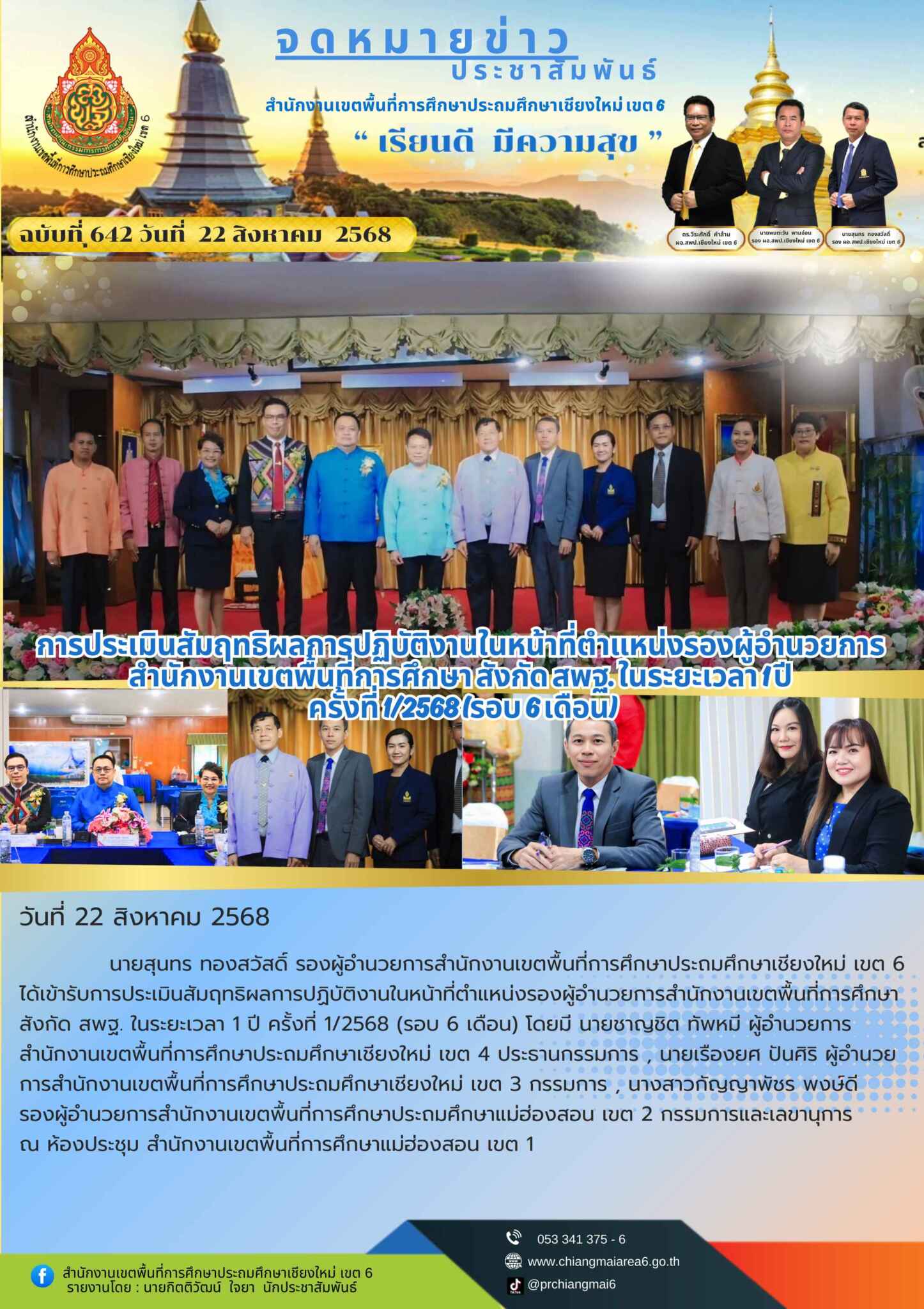 วันที่ 22 สิงหาคม 2568 นายสุนทร ทองสวัสดิ์ รองผู้อำนวยการสำนักงานเขตพื้นที่การศึกษาประถมศึกษาเชียงใหม่ เขต 6 ได้เข้ารับการประเมินสัมฤทธิผลการปฏิบัติงานในหน้าที่ตำแหน่งรองผู้อำนวยการสำนักงานเขตพื้นที่การศึกษา สังกัด สพฐ. ในระยะเวลา 1 ปี ครั้งที่ 1/2568 (รอบ 6 เดือน) โดยมี นายชาญชิต ทัพหมี ผู้อำนวยการสำนักงานเขตพื้นที่การศึกษาประถมศึกษาเชียงใหม่ เขต 4 ประธานกรรมการ , นายเรืองยศ ปันศิริ ผู้อำนวยการสำนักงานเขตพื้นที่การศึกษาประถมศึกษาเชียงใหม่ เขต 3 กรรมการ , นางสาวกัญญาพัชร พงษ์ดี รองผู้อำนวยการสำนักงานเขตพื้นที่การศึกษาประถมศึกษาแม่ฮ่องสอน เขต 2 กรรมการและเลขานุการ ณ ห้องประชุม สำนักงานเขตพื้นที่การศึกษาแม่ฮ่องสอน เขต 1