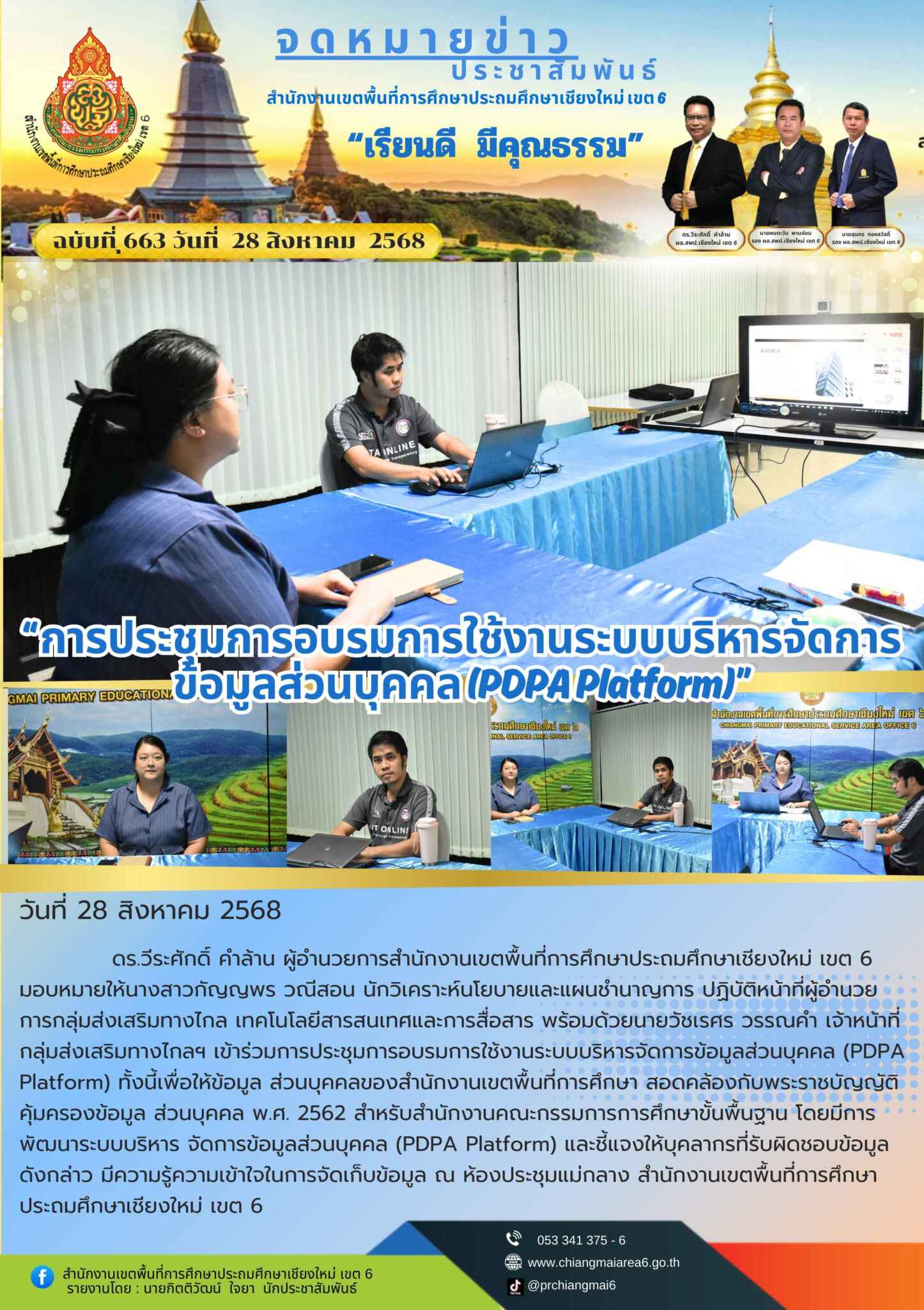 นที่ 28 สิงหาคม 2568 เวลา 09.00 น. ดร.วีระศักดิ์ คำล้าน ผู้อำนวยการสำนักงานเขตพื้นที่การศึกษาประถมศึกษาเชียงใหม่ เขต 6 มอบหมายให้นางสาวกัญญพร วณีสอน นักวิเคราะห์นโยบายและแผนชำนาญการ ปฏิบัติหน้าที่ผู้อำนวยการกลุ่มส่งเสริมทางไกล เทคโนโลยีสารสนเทศและการสื่อสาร พร้อมด้วยนายวัชเรศร วรรณคำ เจ้าหน้าที่กลุ่มส่งเสริมทางไกลฯ เข้าร่วมการประชุมการอบรมการใช้งานระบบบริหารจัดการข้อมูลส่วนบุคคล (PDPA Platform) ทั้งนี้เพื่อให้ข้อมูล ส่วนบุคคลของสำนักงานเขตพื้นที่การศึกษา สอดคล้องกับพระราชบัญญัติคุ้มครองข้อมูล ส่วนบุคคล พ.ศ. 2562 สำหรับสำนักงานคณะกรรมการการศึกษาขั้นพื้นฐาน โดยมีการพัฒนาระบบบริหาร จัดการข้อมูลส่วนบุคคล (PDPA Platform) และชี้แจงให้บุคลากรที่รับผิดชอบข้อมูลดังกล่าว มีความรู้ความเข้าใจในการจัดเก็บข้อมูล ณ ห้องประชุมแม่กลาง สำนักงานเขตพื้นที่การศึกษาประถมศึกษาเชียงใหม่ เขต 6