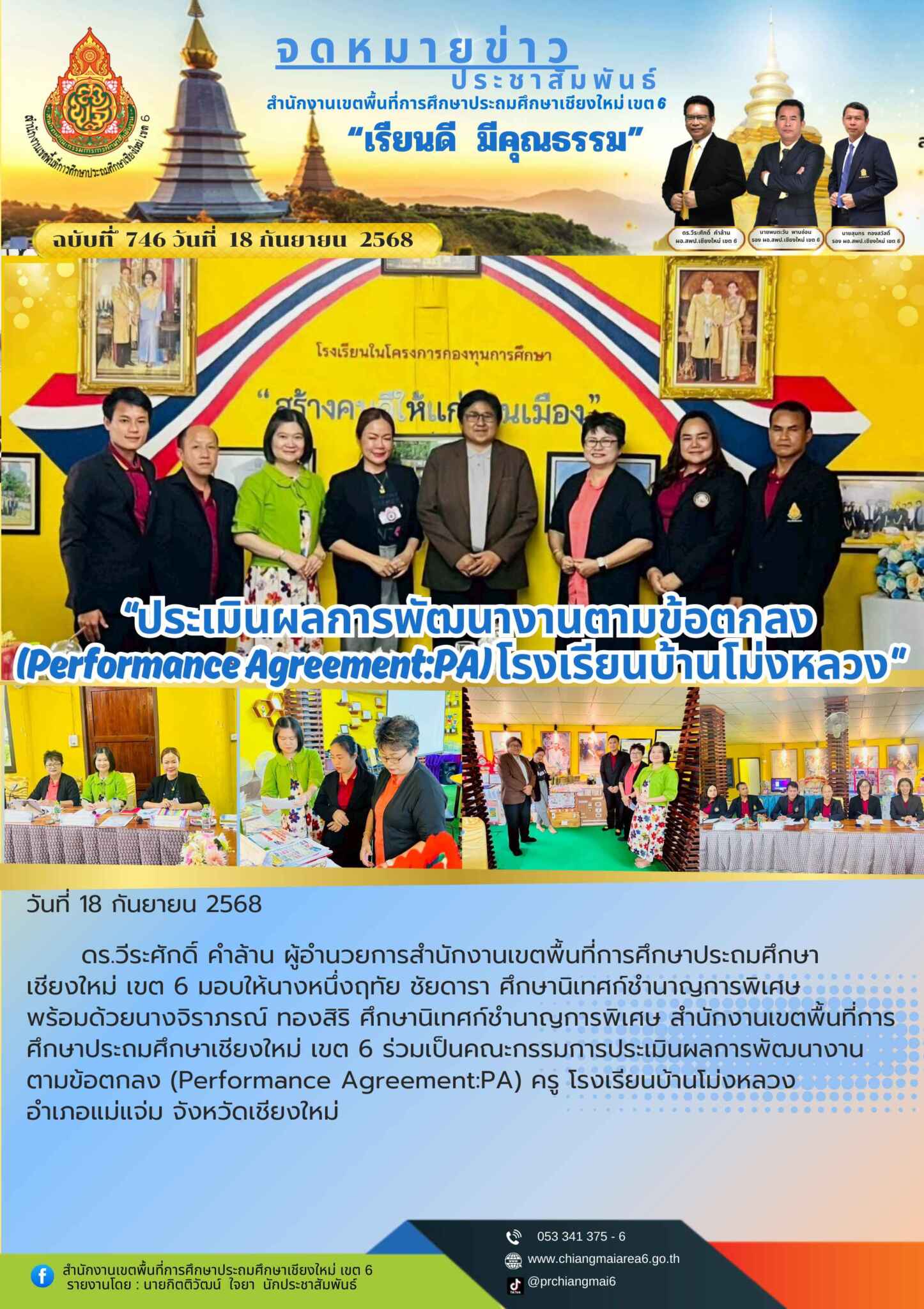 วันที่ 18 กันยายน 2568 ดร.วีระศักดิ์ คำล้าน ผู้อำนวยการสำนักงานเขตพื้นที่การศึกษาประถมศึกษาเชียงใหม่ เขต 6 มอบให้นางหนึ่งฤทัย ชัยดารา ศึกษานิเทศก์ชำนาญการพิเศษ พร้อมด้วยนางจิราภรณ์ ทองสิริ ศึกษานิเทศก์ชำนาญการพิเศษ สำนักงานเขตพื้นที่การศึกษาประถมศึกษาเชียงใหม่ เขต 6 และนางสาววลัยลักษณ์ แก้วมณี ศึกษานิเทศก์ชำนาญการพิเศษ สำนักงานเขตพื้นที่การศึกษาประถมศึกษาลำพูน เขต 1 ร่วมเป็นคณะกรรมการประเมินผลการพัฒนางานตามข้อตกลง (Performance Agreement:PA) ครู โรงเรียนบ้านโม่งหลวง อำเภอแม่แจ่ม จังหวัดเชียงใหม่