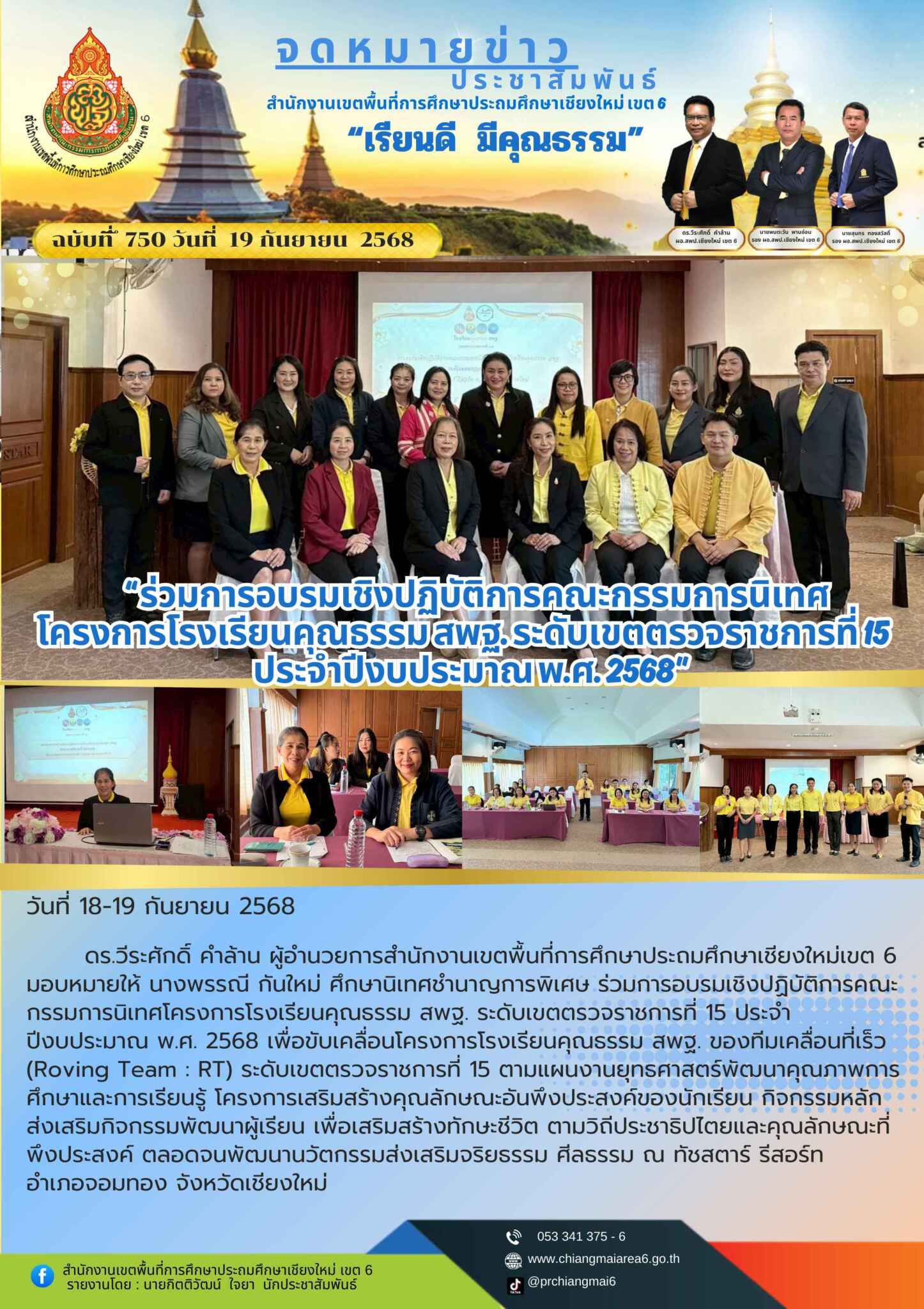 วันที่ 18-19 กันยายน พ.ศ.2568 ดร.วีระศักดิ์ คำล้าน ผู้อำนวยการสำนักงานเขตพื้นที่การศึกษาประถมศึกษาเชียงใหม่เขต 6 มอบหมายให้ นางพรรณี กันใหม่ ศึกษานิเทศชำนาญการพิเศษ ร่วมการอบรมเชิงปฏิบัติการคณะกรรมการนิเทศโครงการโรงเรียนคุณธรรม สพฐ. ระดับเขตตรวจราชการที่ 15 ประจำปีงบประมาณ พ.ศ. 2568 เพื่อขับเคลื่อนโครงการโรงเรียนคุณธรรม สพฐ. ของทีมเคลื่อนที่เร็ว (Roving Team : RT) ระดับเขตตรวจราชการที่ 15 ตามแผนงานยุทธศาสตร์พัฒนาคุณภาพการศึกษาและการเรียนรู้ โครงการเสริมสร้างคุณลักษณะอันพึงประสงค์ของนักเรียน กิจกรรมหลัก ส่งเสริมกิจกรรมพัฒนาผู้เรียน เพื่อเสริมสร้างทักษะชีวิต ตามวิถีประชาธิปไตยและคุณลักษณะที่พึงประสงค์ ตลอดจนพัฒนานวัตกรรมส่งเสริมจริยธรรม ศีลธรรม ณ ทัชสตาร์ รีสอร์ท อำเภอจอมทอง จังหวัดเชียงใหม่