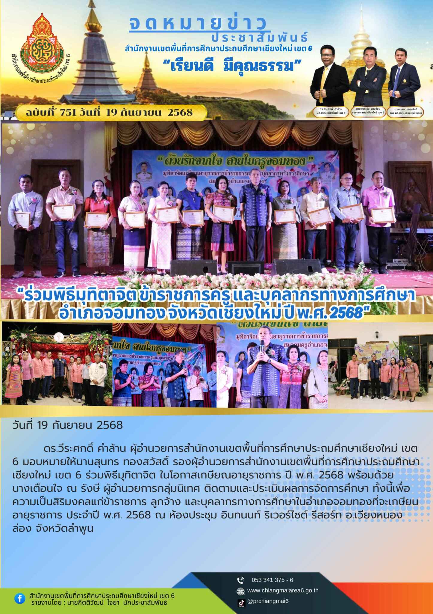 วันที่ 19 กันยายน 2568 ดร.วีระศักดิ์ คำล้าน ผุ้อำนวยการสำนักงานเขตพื้นที่การศึกษาประถมศึกษาเชียงใหม่ เขต 6 มอบหมายให้นานสุนทร ทองสวัสดิ์ รองผุ้อำนวยการสำนักงานเขตพื้นที่การศึกษาประถมศึกษาเชียงใหม่ เขต 6 ร่วมพิธีมุทิตาจิต ในโอกาสเกษียณอายุราชการ ปี พ.ศ. 2568 พร้อมด้วยนางเตือนใจ ณ รังษี ผู้อำนวยการกลุ่มนิเทศ ติดตามและประเมินผลการจัดการศึกษา ทั้งนี้เพื่อความเป็นสิริมงคลแก่ข้าราชการ ลูกจ้าง และบุคลากรทางการศึกษาในอำเภอจอมทองที่จะเกษียนอายุราชการ ประจำปี พ.ศ. 2568 ณ ห้องประชุม อินทนนท์ ริเวอร์ไซต์ รีสอร์ท อ.เวียงหนองล่อง จังหวัดลำพูน