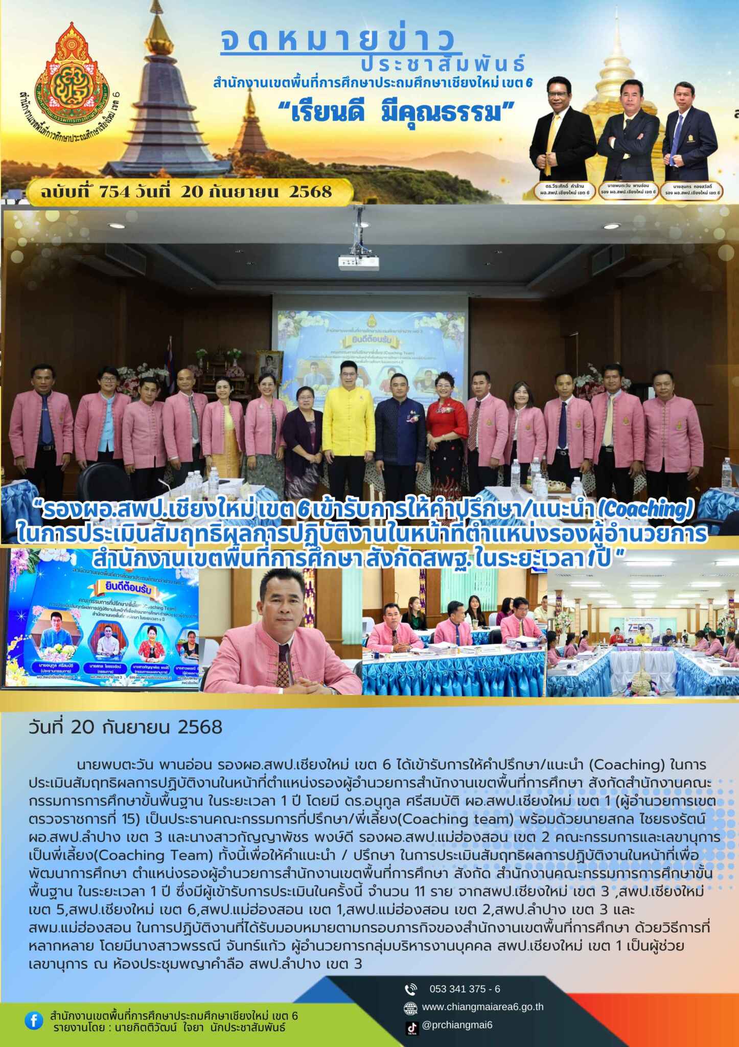 วันที่ 20 กันยายน 2568 นายพบตะวัน พานอ่อน รองผอ.สพป.เชียงใหม่ เขต 6 ได้เข้ารับการให้คำปรึกษา/แนะนำ (Coaching) ในการประเมินสัมฤทธิผลการปฏิบัติงานในหน้าที่ตำแหน่งรองผู้อำนวยการสำนักงานเขตพื้นที่การศึกษา สังกัดสำนักงานคณะกรรมการการศึกษาขั้นพื้นฐาน ในระยะเวลา 1 ปี โดยมี ดร.อนุกูล ศรีสมบัติ ผอ.สพป.เชียงใหม่ เขต 1 (ผู้อำนวยการเขตตรวจราชการที่ 15) เป็นประธานคณะกรรมการที่ปรึกษา/พี่เลี้ยง(Coaching team) พร้อมด้วยนายสกล ไชยธงรัตน์ ผอ.สพป.ลำปาง เขต 3 และนางสาวกัญญาพัชร พงษ์ดี รองผอ.สพป.แม่ฮ่องสอน เขต 2 คณะกรรมการและเลขานุการ เป็นพี่เลี้ยง(Coaching Team) ทั้งนี้เพื่อให้คำแนะนำ / ปรึกษา ในการประเมินสัมฤทธิผลการปฏิบัติงานในหน้าที่เพื่อพัฒนาการศึกษา ตำแหน่งรองผู้อำนวยการสำนักงานเขตพื้นที่การศึกษา สังกัด สำนักงานคณะกรรมการการศึกษาขั้นพื้นฐาน ในระยะเวลา 1 ปี ซึ่งมีผู้เข้ารับการประเมินในครั้งนี้ จำนวน 11 ราย จากสพป.เชียงใหม่ เขต 3 ,สพป.เชียงใหม่ เขต 5,สพป.เชียงใหม่ เขต 6,สพป.แม่ฮ่องสอน เขต 1,สพป.แม่ฮ่องสอน เขต 2,สพป.ลำปาง เขต 3 และสพม.แม่ฮ่องสอน ในการปฏิบัติงานที่ได้รับมอบหมายตามกรอบภารกิจของสำนักงานเขตพื้นที่การศึกษา ด้วยวิธีการที่หลากหลาย โดยมีนางสาวพรรณี จันทร์แก้ว ผู้อำนวยการกลุ่มบริหารงานบุคคล สพป.เชียงใหม่ เขต 1 เป็นผู้ช่วยเลขานุการ ณ ห้องประชุมพญาคำลือ สพป.ลำปาง เขต 3