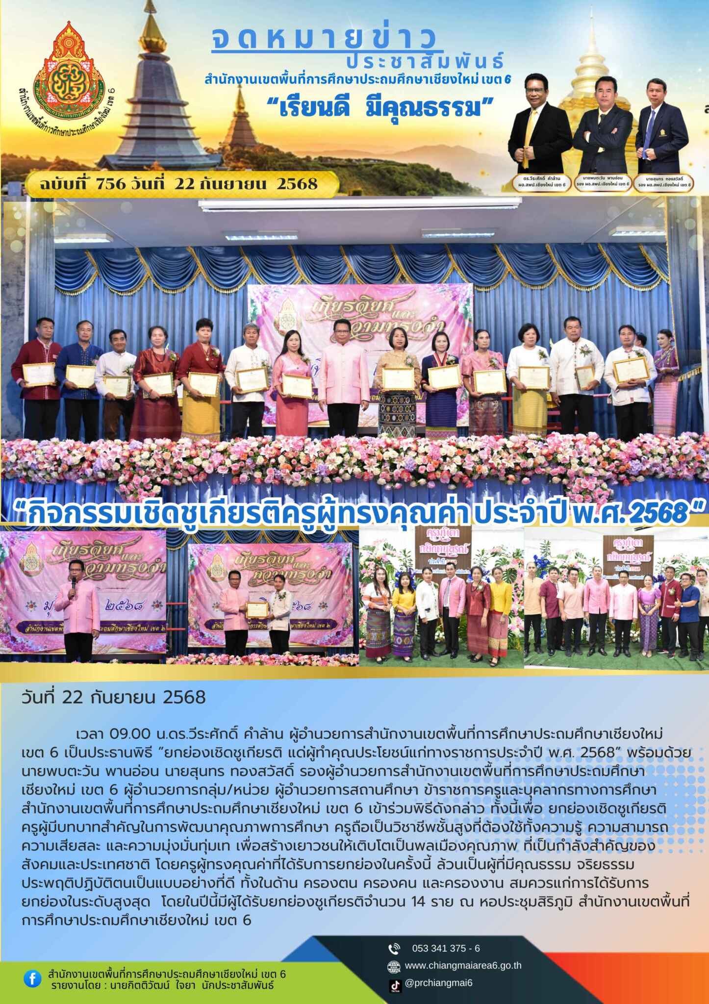 วันที่ 22 กันยายน 2568 เวลา 09.00 น.ดร.วีระศักดิ์ คำล้าน ผู้อำนวยการสำนักงานเขตพื้นที่การศึกษาประถมศึกษาเชียงใหม่ เขต 6 เป็นประธานพิธี ”ยกย่องเชิดชูเกียรติ แด่ผู้ทำคุณประโยชน์แก่ทางราชการประจำปี พ.ศ. 2568” พร้อมด้วย นายพบตะวัน พานอ่อน นายสุนทร ทองสวัสดิ์ รองผู้อำนวยการสำนักงานเขตพื้นที่การศึกษาประถมศึกษาเชียงใหม่ เขต 6 ผู้อำนวยการกลุ่ม/หน่วย ผู้อำนวยการสถานศึกษา ข้าราชการครูและบุคลากรทางการศึกษา สำนักงานเขตพื้นที่การศึกษาประถมศึกษาเชียงใหม่ เขต 6 เข้าร่วมพิธีดังกล่าว ทั้งนี้เพื่อ ยกย่องเชิดชูเกียรติ ครูผู้มีบทบาทสำคัญในการพัฒนาคุณภาพการศึกษา ครูถือเป็นวิชาชีพชั้นสูงที่ต้องใช้ทั้งความรู้ ความสามารถ ความเสียสละ และความมุ่งมั่นทุ่มเท เพื่อสร้างเยาวชนให้เติบโตเป็นพลเมืองคุณภาพ ที่เป็นกำลังสำคัญของสังคมและประเทศชาติ โดยครูผู้ทรงคุณค่าที่ได้รับการยกย่องในครั้งนี้ ล้วนเป็นผู้ที่มีคุณธรรม จริยธรรม ประพฤติปฏิบัติตนเป็นแบบอย่างที่ดี ทั้งในด้าน ครองตน ครองคน และครองงาน สมควรแก่การได้รับการยกย่องในระดับสูงสุด โดยในปีนี้มีผู้ได้รับยกย่องชูเกียรติจำนวน 14 ราย ณ หอประชุมสิริภูมิ สำนักงานเขตพื้นที่การศึกษาประถมศึกษาเชียงใหม่ เขต 6