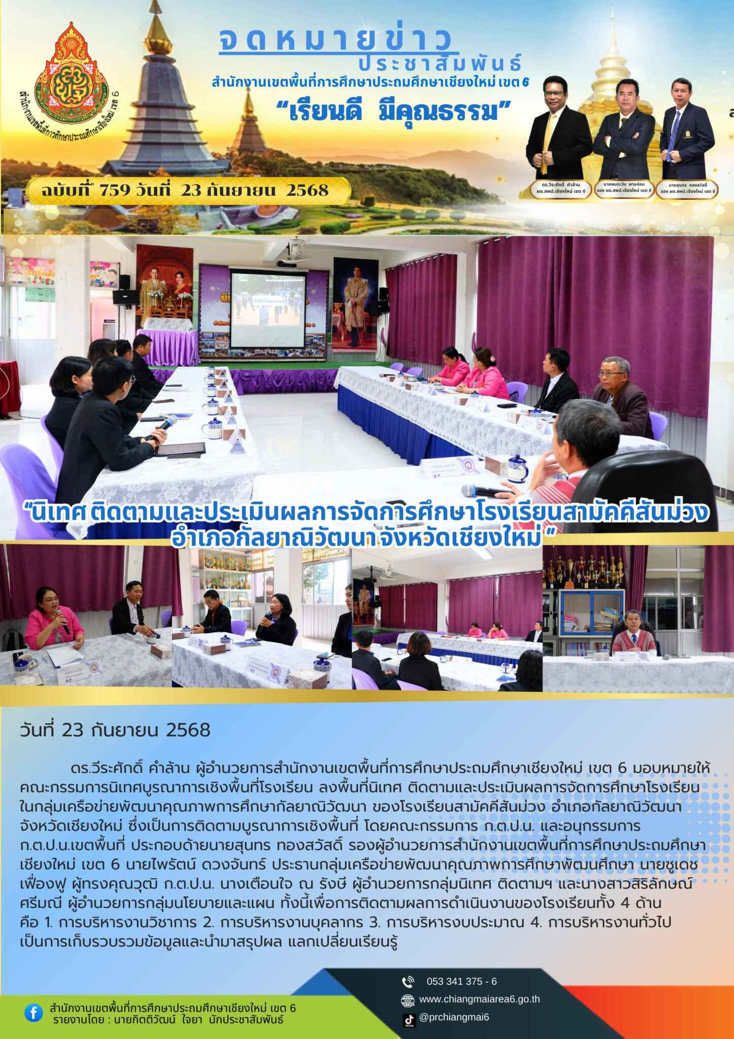 ดร.วีระศักดิ์ คำล้าน ผู้อำนวยการสำนักงานเขตพื้นที่การศึกษาประถมศึกษาเชียงใหม่ เขต 6 มอบหมายให้คณะกรรมการนิเทศบูรณาการเชิงพื้นที่โรงเรียน ลงพื้นที่นิเทศ ติดตามและประเมินผลการจัดการศึกษาโรงเรียนในกลุ่มเครือข่ายพัฒนาคุณภาพการศึกษากัลยาณิวัฒนา ของโรงเรียนสามัคคีสันม่วง อำเภอกัลยาณิวัฒนา จังหวัดเชียงใหม่ ซึ่งเป็นการติดตามบูรณาการเชิงพื้นที่ โดยคณะกรรมการ ก.ต.ป.น. และอนุกรรมการ ก.ต.ป.น.เขตพื้นที่ ประกอบด้ายนายสุนทร ทองสวัสดิ์ รองผู้อำนวยการสำนักงานเขตพื้นที่การศึกษาประถมศึกษาเชียงใหม่ เขต 6 นายไพรัตน์ ดวงจันทร์ ประธานกลุ่มเครือข่ายพัฒนาคุณภาพการศึกษาพัฒนศึกษา นายชูเดช เฟื่องฟู ผู้ทรงคุณวุฒิ ก.ต.ป.น. นางเตือนใจ ณ รังษี ผู้อำนวยการกลุ่มนิเทศ ติดตามฯ และนางสาวสิริลักษณ์ ศรีมณี ผู้อำนวยการกลุ่มนโยบายและแผน ทั้งนี้เพื่อการติดตามผลการดำเนินงานของโรงเรียนทั้ง 4 ด้าน คือ 1. การบริหารงานวิชาการ 2. การบริหารงานบุคลากร 3. การบริหารงบประมาณ 4. การบริหารงานทั่วไป เป็นการเก็บรวบรวมข้อมูลและนำมาสรุปผล แลกเปลี่ยนเรียนรู้