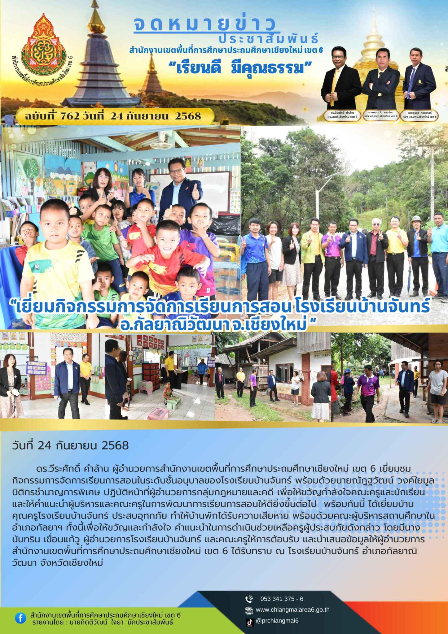 วันที่ 24 กันยายน 2568 ดร.วีระศักดิ์ คำล้าน ผู้อำนวยการสำนักงานเขตพื้นที่การศึกษาประถมศึกษาเชียงใหม่ เขต 6 เยี่ยมชมกิจกรรมการจัดการเรียนการสอนในระดับชั้นอนุบาลของโรงเรียนบ้านจันทร์ พร้อมด้วยนายณัฎฐวัฒน์ วงค์ใยมูล นิติกรชำนาญการพิเศษ ปฏิบัติหน้าที่ผู้อำนวยการกลุ่มกฎหมายและคดี เพื่อให้ขวัญกำลังใจคณะครูและนักเรียน และให้คำแนะนำผู้บริหารและคณะครูในการพัฒนาการเรียนการสอนให้ดียิ่งขึ้นต่อไปพร้อมกันนี้ ได้เยี่ยมบ้านคุณครูโรงเรียนบ้านจันทร์ ประสบอุทกภัย ทำให้บ้านพักได้รับความเสียหาย พร้อมด้วยคณะผู้บริหารสถานศึกษาในอำเภอกัลยาฯ ทั้งนี้เพื่อให้ขวัญและกำลังใจ คำแนะนำในการดำเนินช่วยเหลือครูผู้ประสบภัยดังกล่าว โดยมีนางนันทริน เขื่อนแก้วู ผู้อำนวยการโรงเรียนบ้านจันทร์ และคณะครูให้การต้อนรับ และนำเสนอข้อมูลให้ผู้อำนวยการสำนักงานเขตพื้นที่การศึกษาประถมศึกษาเชียงใหม่ เขต 6 ได้รับทราบ ณ โรงเรียนบ้านจันทร์ อำเภอกัลยาณิวัฒนา จังหวัดเชียงใหม่