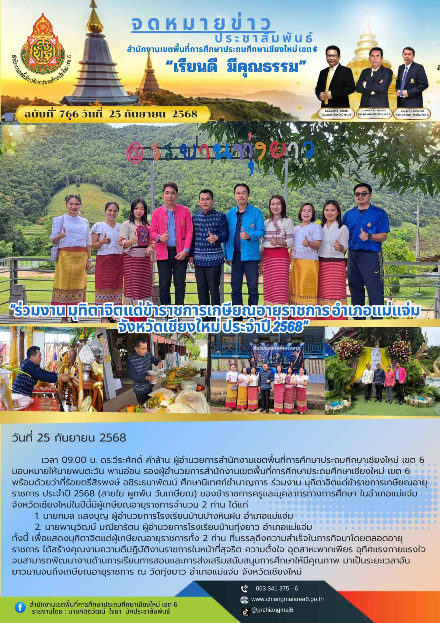 วันที่ 25 กันยายน 2568 เวลา 09.00 น. ดร.วีระศักดิ์ คำล้าน ผู้อำนวยการสำนักงานเขตพื้นที่การศึกษาประถมศึกษาเชียงใหม่ เขต 6 มอบหมายให้นายพบตะวัน พานอ่อน รองผู้อำนวยการสำนักงานเขตพื้นที่การศึกษาประถมศึกษาเชียงใหม่ เขต 6 พร้อมด้วยว่าที่ร้อยตรีสิรพงษ์ อชิระธนาพัฒน์ ศึกษานิเทศก์ชำนาญการ ร่วมงาน มุทิตาจิตแด่ข้าราชการเกษียณอายุราชการ ประจำปี 2568 (สายใย ผูกพัน วันเกษียณ) ของข้าราชการครูและบุคลากรทางการศึกษา ในอำเภอแม่แจ่ม จังหวัดเชียงใหม่ในปีนี้มีผู้เกษียณอายุราชการจำนวน 2 ท่าน ได้แก่ 1. นายกมล แสงบุญ ผู้อำนวยการโรงเรียนบ้านปางหินฝน อำเภอแม่แจ่ม 2. นายพานุวัฒน์ มณียารัตน ผู้อำนวยการโรงเรียนบ้านทุ่งยาว อำเภอแม่แจ่ม ทั้งนี้ เพื่อแสดงมุทิตาจิตแด่ผู้เกษียณอายุราชการทั้ง 2 ท่าน ที่บรรลุถึงความสำเร็จในภารกิจมาโดยตลอดอายุราชการ ได้สร้างคุณงามความดีปฏิบัติงานราชการในหน้าที่สุจริต ความตั้งใจ อุตสาหะพากเพียร อุทิศแรงกายแรงใจ จนสามารถพัฒนางานด้านการเรียนการสอนและการส่งเสริมสนับสนุนการศึกษาให้มีคุณภาพ มาเป็นระยะเวลาอันยาวนานจนถึงเกษียณอายุราชการ ณ วัดทุ่งยาว อำเภอแม่แจ่ม จังหวัดเชียงใหม่