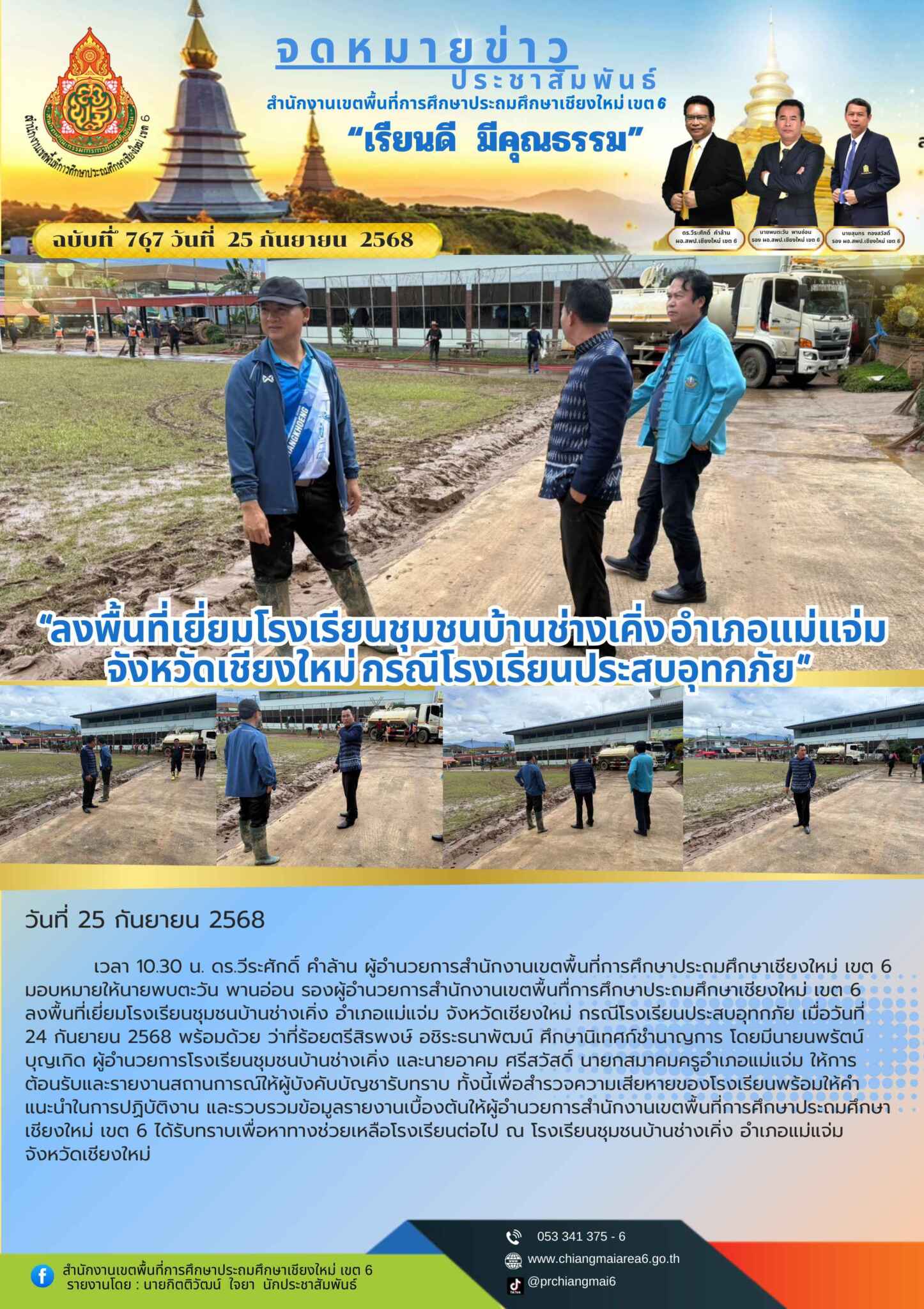 วันที่ 25 กันยายน 2568 เวลา 10.30 น. ดร.วีระศักดิ์ คำล้าน ผู้อำนวยการสำนักงานเขตพื้นที่การศึกษาประถมศึกษาเชียงใหม่ เขต 6 มอบหมายให้นายพบตะวัน พานอ่อน รองผู้อำนวยการสำนักงานเขตพื้นทื่การศึกษาประถมศึกษาเชียงใหม่ เขต 6 ลงพื้นที่เยี่ยมโรงเรียนชุมชนบ้านช่างเคิ่ง อำเภอแม่แจ่ม จังหวัดเชียงใหม่ กรณีโรงเรียนประสบอุทกภัย เมื่อวันที่ 24 กันยายน 2568 พร้อมด้วย ว่าที่ร้อยตรีสิรพงษ์ อชิระธนาพัฒน์ ศึกษานิเทศก์ชำนาญการ โดยมีนายนพรัตน์ บุญเกิด ผู้อำนวยการโรงเรียนชุมชนบ้านช่างเคิ่ง และนายอาคม ศรีสวัสดิ์ นายกสมาคมครูอำเภอแม่แจ่ม ให้การต้อนรับและรายงานสถานการณ์ให้ผู้บังคับบัญชารับทราบ ทั้งนี้เพื่อสำรวจความเสียหายของโรงเรียนพร้อมให้คำแนะนำในการปฏิบัติงาน และรวบรวมข้อมูลรายงานเบื้องต้นให้ผู้อำนวยการสำนักงานเขตพื้นที่การศึกษาประถมศึกษาเชียงใหม่ เขต 6 ได้รับทราบเพื่อหาทางช่วยเหลือโรงเรียนต่อไป ณ โรงเรียนชุมชนบ้านช่างเคิ่ง อำเภอแม่แจ่ม จังหวัดเชียงใหม่