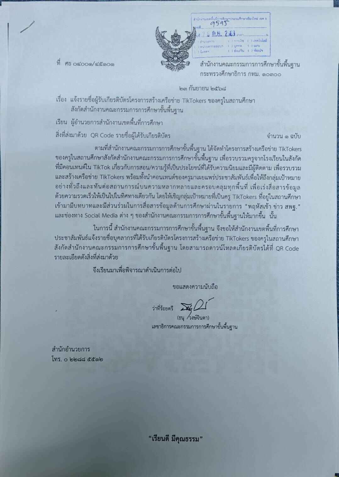 สพฐ.มอบเกียรติบัตรโครงการสร้างเครือข่าย Tik Tokers รายละเอียดตามเอกสารแนบมาพร้อมนี้