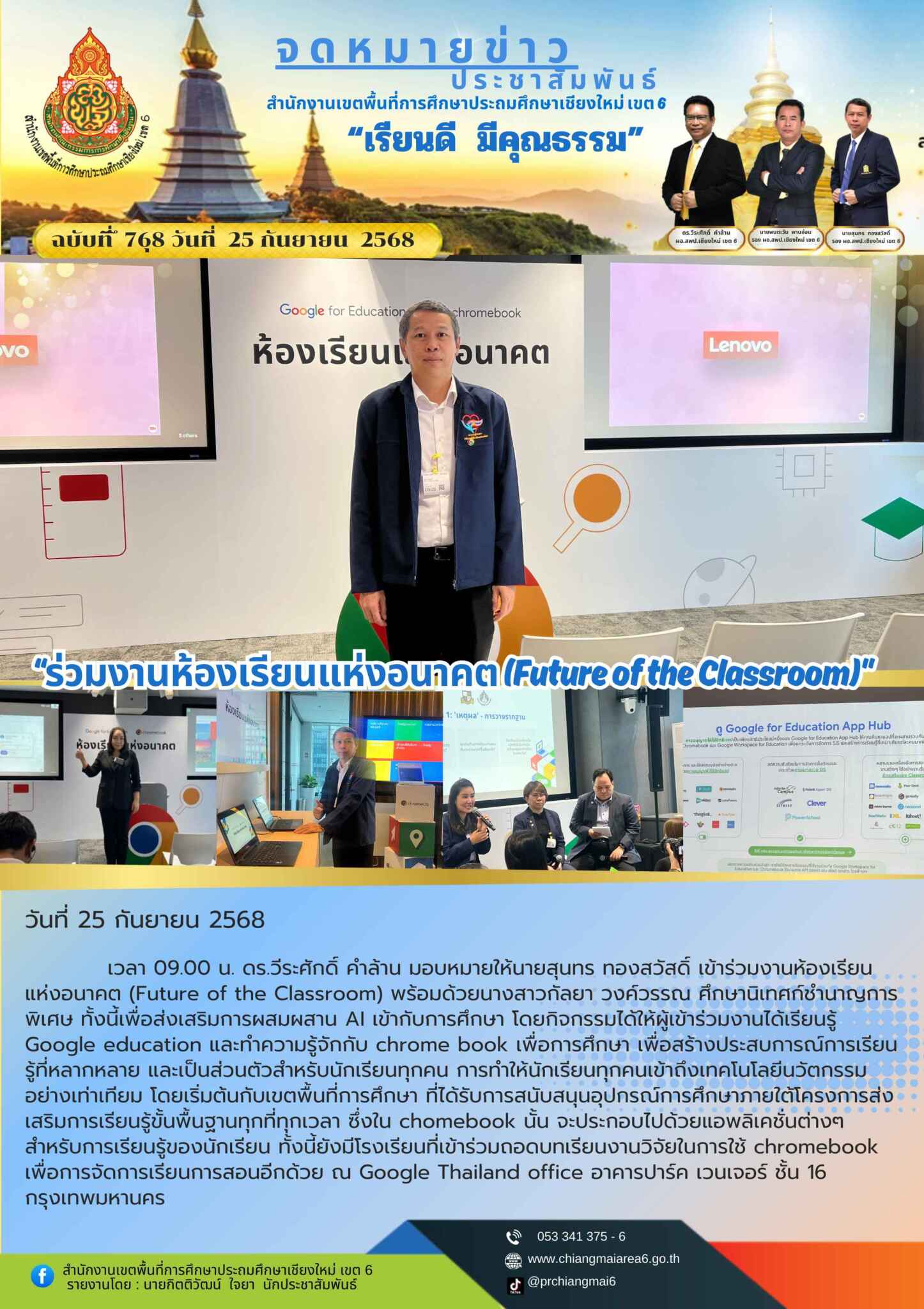 วันที่ 25 กันยายน 2568 เวลา 09.00 น. ดร.วีระศักดิ์ คำล้าน มอบหมายให้นายสุนทร ทองสวัสดิ์ เข้าร่วมงานห้องเรียนแห่งอนาคต (Future of the Classroom) พร้อมด้วยนางสาวกัลยา วงค์วรรณ ศึกษานิเทศก์ชำนาญการพิเศษ ทั้งนี้เพื่อส่งเสริมการผสมผสาน AI เข้ากับการศึกษา โดยกิจกรรมได้ให้ผู้เข้าร่วมงานได้เรียนรู้ Google education และทำความรู้จักกับ chrome book เพื่อการศึกษา เพื่อสร้างประสบการณ์การเรียนรู้ที่หลากหลาย และเป็นส่วนตัวสำหรับนักเรียนทุกคน การทำให้นักเรียนทุกคนเข้าถึงเทคโนโลยีนวัตกรรมอย่างเท่าเทียม โดยเริ่มต้นกับเขตพื้นที่การศึกษา ที่ได้รับการสนับสนุนอุปกรณ์การศึกษาภายใต้โครงการส่งเสริมการเรียนรู้ขั้นพื้นฐานทุกที่ทุกเวลา ซึ่งใน chomebook นั้น จะประกอบไปด้วยแอพลิเคชั่นต่างๆ สำหรับการเรียนรู้ของนักเรียน ทั้งนี้ยังมีโรงเรียนที่เข้าร่วมถอดบทเรียนงานวิจัยในการใช้ chromebook เพื่อการจัดการเรียนการสอนอีกด้วย ณ Google Thailand office อาคารปาร์ค เวนเจอร์ ชั้น 16 กรุงเทพมหานคร