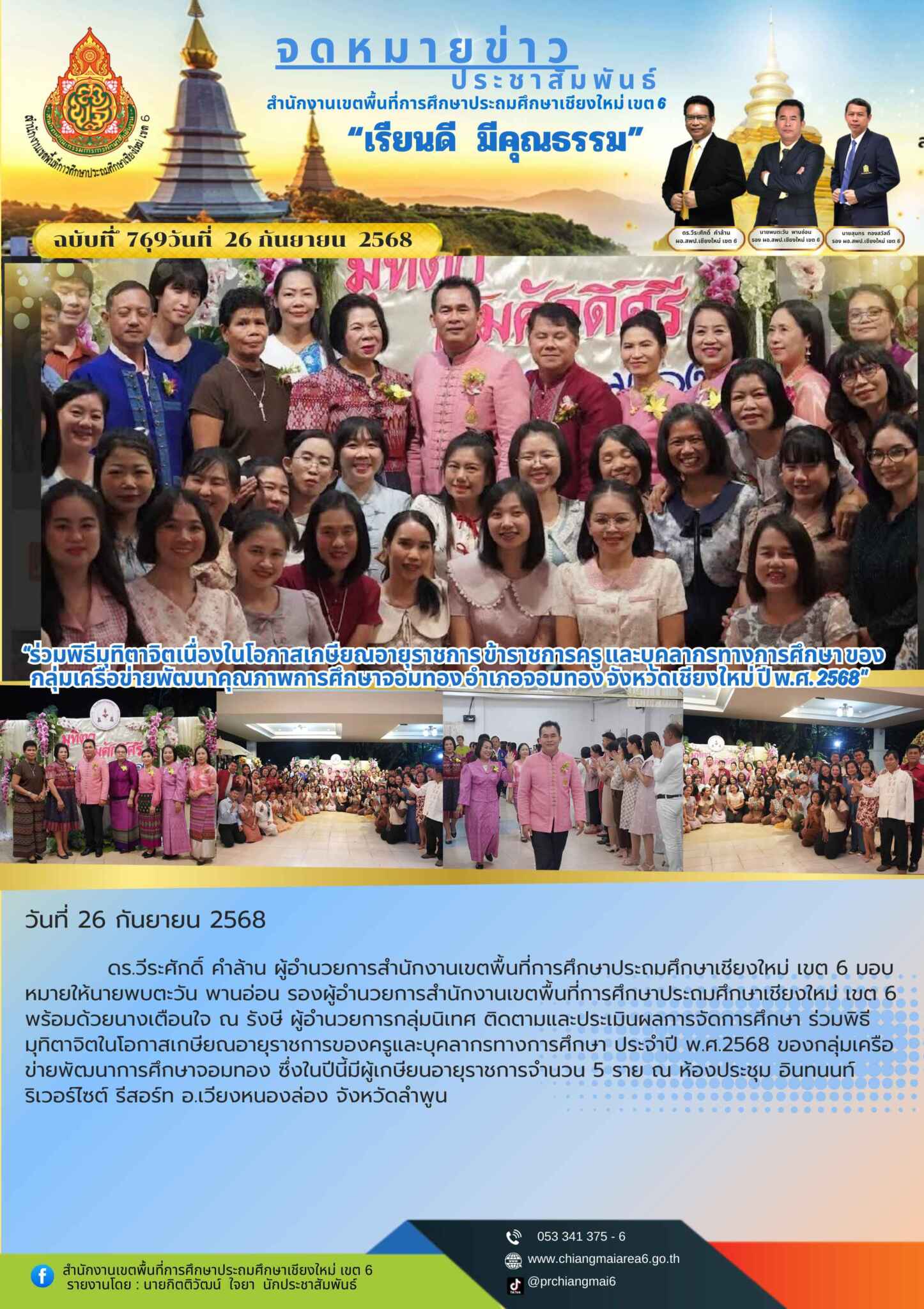 วันที่ 26 กันยายน 2568 ดร.วีระศักดิ์ คำล้าน ผู้อำนวยการสำนักงานเขตพื้นที่การศึกษาประถมศึกษาเชียงใหม่ เขต 6 มอบหมายให้นายพบตะวัน พานอ่อน รองผู้อำนวยการสำนักงานเขตพื้นที่การศึกษาประถมศึกษาเชียงใหม่ เขต 6 พร้อมด้วยนางเตือนใจ ณ รังษี ผู้อำนวยการกลุ่มนิเทศ ติดตามและประเมินผลการจัดการศึกษา ร่วมพิธีมุทิตาจิตในโอกาสเกษียณอายุราชการของครูและบุคลากรทางการศึกษา ประจำปี พ.ศ.2568 ของกลุ่มเครือข่ายพัฒนาการศึกษาจอมทอง ซึ่งในปีนี้มีผู้เกษียนอายุราชการจำนวน 5 ราย ณ ห้องประชุม อินทนนท์ ริเวอร์ไซต์ รีสอร์ท อ.เวียงหนองล่อง จังหวัดลำพูน