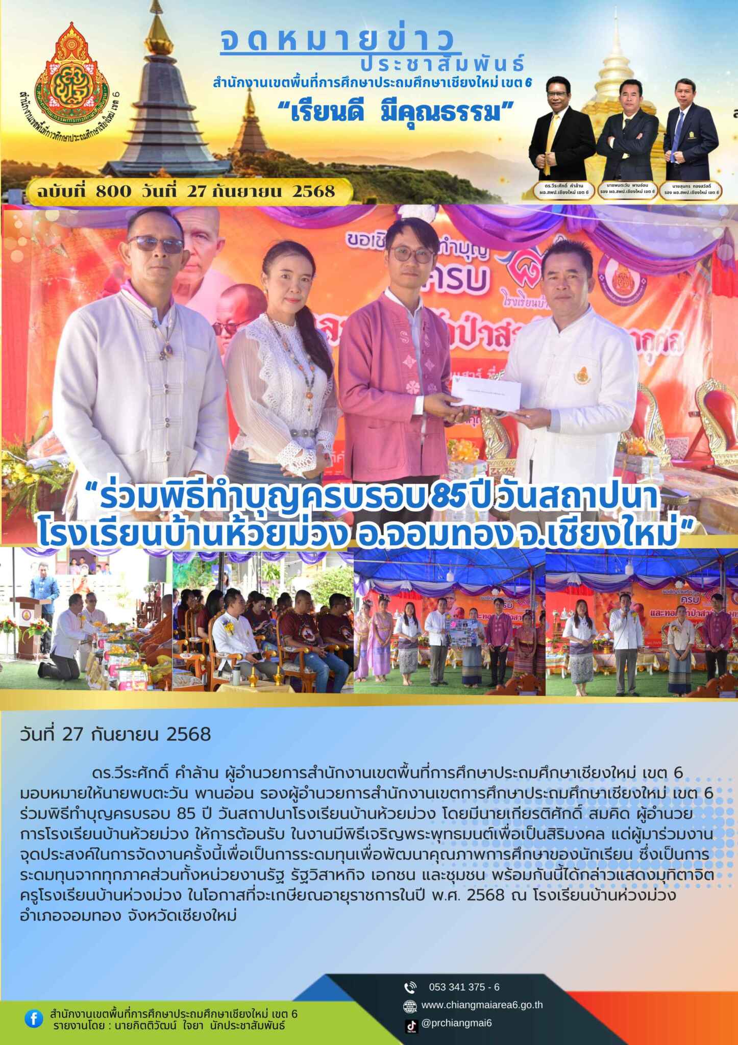 วันที่ 27 กันยายน 2568 ดร.วีระศักดิ์ คำล้าน ผู้อำนวยการสำนักงานเขตพื้นที่การศึกษาประถมศึกษาเชียงใหม่ เขต 6 มอบหมายให้นายพบตะวัน พานอ่อน รองผู้อำนวยการสำนักงานเขตการศึกษาประถมศึกษาเชียงใหม่ เขต 6 ร่วมพิธีทำบุญครบรอบ 85 ปี วันสถาปนาโรงเรียนบ้านห้วยม่วง โดยมีนายเกียรติศักดิ์ สมคิด ผู้อำนวยการโรงเรียนบ้านห้วยม่วง ให้การต้อนรับ ในงานมีพิธีเจริญพระพุทธมนต์เพื่อเป็นสิริมงคล แด่ผู้มาร่วมงาน จุดประสงค์ในการจัดงานครั้งนี้เพื่อเป็นการระดมทุนเพื่อพัฒนาคุณภาพการศึกษาของนักเรียน ซึ่งเป็นการระดมทุนจากทุกภาคส่วนทั้งหน่วยงานรัฐ รัฐวิสาหกิจ เอกชน และชุมชน พร้อมกันนี้ได้กล่าวแสดงมุทิตาจิต ครูโรงเรียนบ้านห่วงม่วง ในโอกาสที่จะเกษียณอายุราชการในปี พ.ศ. 2568 ณ โรงเรียนบ้านห่วงม่วง อำเภอจอมทอง จังหวัดเชียงใหม่