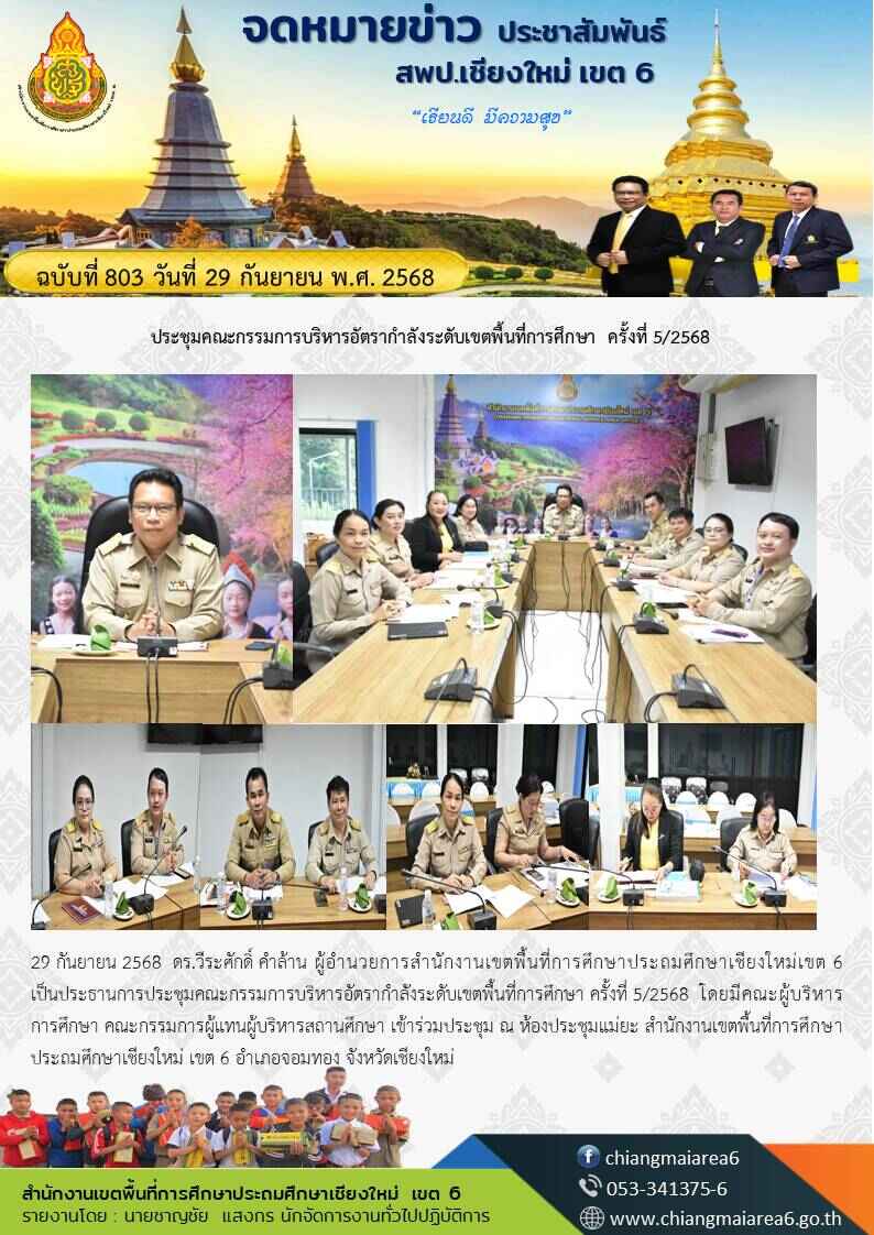 29 กันยายน 2568 ดร.วีระศักดิ์ คำล้าน ผู้อำนวยการสำนักงานเขตพื้นที่การศึกษาประถมศึกษาเชียงใหม่เขต 6 เป็นประธานการประชุมคณะกรรมการบริหารอัตรากำลังระดับเขตพื้นที่การศึกษา ครั้งที่ 5/2568 โดยมีคณะผู้บริหารการศึกษา คณะกรรมการผู้แทนผู้บริหารสถานศึกษา เข้าร่วมประชุม ณ ห้องประชุมแม่ยะ สำนักงานเขตพื้นที่การศึกษาประถมศึกษาเชียงใหม่ เขต 6 อำเภอจอมทอง จังหวัดเชียงใหม่