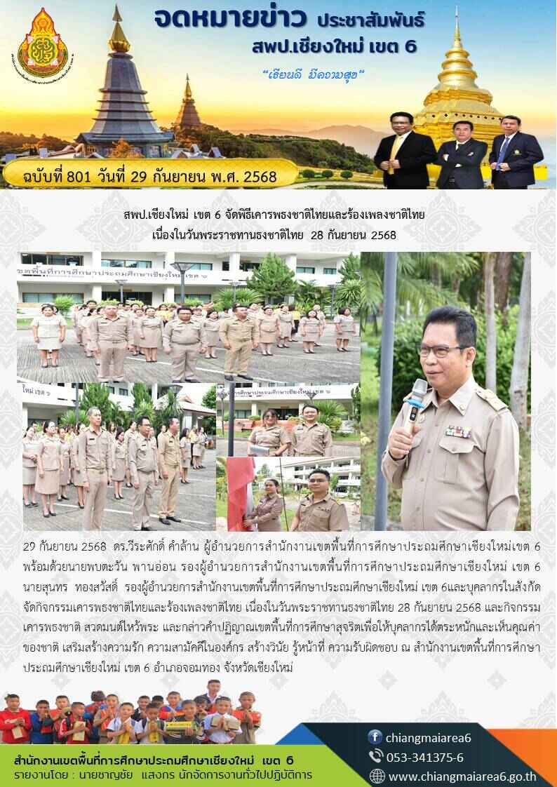 29 กันยายน 2568 ดร.วีระศักดิ์ คำล้าน ผู้อำนวยการสำนักงานเขตพื้นที่การศึกษาประถมศึกษาเชียงใหม่เขต 6 พร้อมด้วยนายพบตะวัน พานอ่อน รองผู้อำนวยการสำนักงานเขตพื้นที่การศึกษาประถมศึกษาเชียงใหม่ เขต 6 นายสุนทร ทองสวัสดิ์ รองผู้อำนวยการสำนักงานเขตพื้นที่การศึกษาประถมศึกษาเชียงใหม่ เขต 6และบุคลากรในสังกัดจัดกิจกรรมเคารพธงชาติไทยและร้องเพลงชาติไทย เนื่องในวันพระราชทานธงชาติไทย 28 กันยายน 2568 และกิจกรรมเคารพธงชาติ สวดมนต์ไหว้พระ และกล่าวคำปฏิญาณเขตพื้นที่การศึกษาสุจริตเพื่อให้บุคลากรได้ตระหนักและเห็นคุณค่าของชาติ เสริมสร้างความรัก ความสามัคคีในองค์กร สร้างวินัย รู้หน้าที่ ความรับผิดชอบ ณ สำนักงานเขตพื้นที่การศึกษาประถมศึกษาเชียงใหม่ เขต 6 อำเภอจอมทอง จังหวัดเชียงใหม่