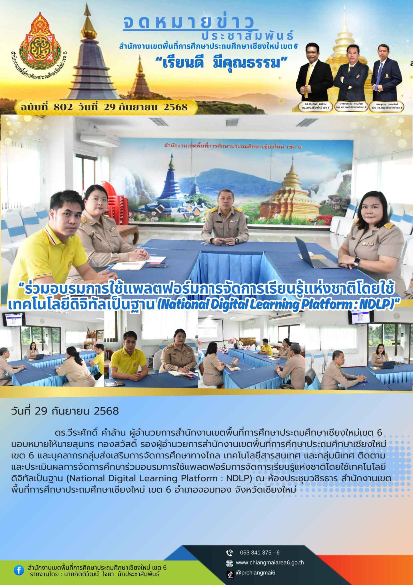 ดร.วีระศักดิ์ คำล้าน ผู้อำนวยการสำนักงานเขตพื้นที่การศึกษาประถมศึกษาเชียงใหม่เขต 6 มอบหมายให้นายสุนทร ทองสวัสดิ์ รองผู้อำนวยการสำนักงานเขตพื้นที่การศึกษาประถมศึกษาเชียงใหม่ เขต 6 และบุคลากรกลุ่มส่งเสริมการจัดการศึกษาทางไกล เทคโนโลยีสารสนเทศ และกลุ่มนิเทศ ติดตาม และประเมินผลการจัดการศึกษาร่วมอบรมการใช้แพลตฟอร์มการจัดการเรียนรู้แห่งชาติโดยใช้เทคโนโลยีดิจิทัลเป็นฐาน (National Digital Learning Platform : NDLP) ณ ห้องประชุมวชิรธาร สำนักงานเขตพื้นที่การศึกษาประถมศึกษาเชียงใหม่ เขต 6 อำเภอจอมทอง จังหวัดเชียงใหม่