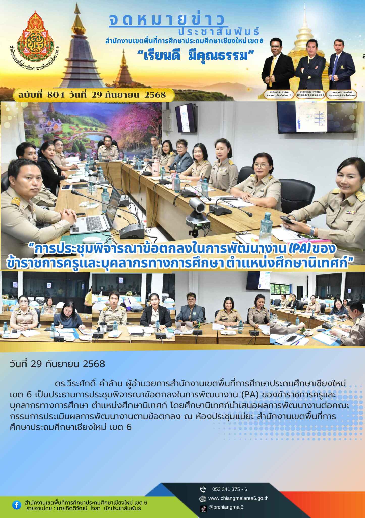 วันที่ 29 กันยายน 2568 ดร.วีระศักดิ์ คำล้าน ผู้อำนวยการสำนักงานเขตพื้นที่การศึกษาประถมศึกษาเชียงใหม่เขต 6 เป็นประธานการประชุมพิจารณาข้อตกลงในการพัฒนางาน (PA) ของข้าราชการครูและบุคลากรทางการศึกษา ตำแหน่งศึกษานิเทศก์ โดยศึกษานิเทศก์นำเสนอผลการพัฒนางานต่อคณะกรรมการประเมินผลการพัฒนางานตามข้อตกลง ณ ห้องประชุมแม่ยะ สำนักงานเขตพื้นที่การศึกษาประถมศึกษาเชียงใหม่ เขต 6