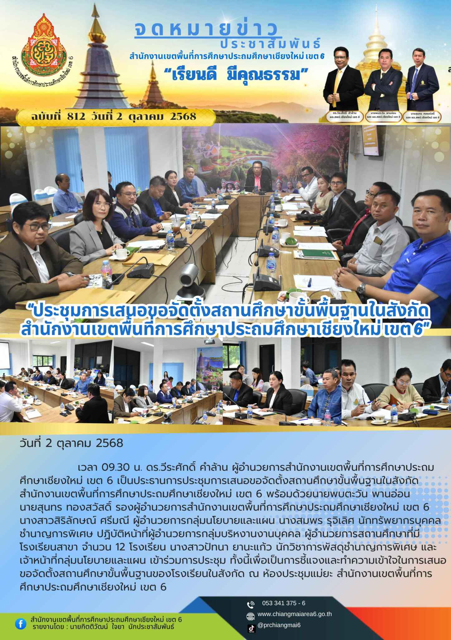 วันที่ 2 ตุลาคม 2568 เวลา 09.30 น. ดร.วีระศักดิ์ คำล้าน ผู้อำนวยการสำนักงานเขตพื้นที่การศึกษาประถมศึกษาเชียงใหม่ เขต 6 เป็นประธานการประชุมการเสนอขอจัดตั้งสถานศึกษาขั้นพื้นฐานในสังกัดสำนักงานเขตพื้นที่การศึกษาประถมศึกษาเชียงใหม่ เขต 6 พร้อมด้วยนายพบตะวัน พานอ่อน นายสุนทร ทองสวัสดิ์ รองผู้อำนวยการสำนักงานเขตพื้นที่การศึกษาประถมศึกษาเชียงใหม่ เขต 6 นางสาวสิริลักษณ์ ศรีมณี ผู้อำนวยการกลุ่มนโยบายและแผน นางสมพร รุจิเลิศ นักทรัพยากรบุคคลชำนาญการพิเศษ ปฏิบัติหน้าที่ผู้อำนวยการกลุ่มบริหงานงานบุคคล ผู้อำนวยการสถานศึกษาที่มีโรงเรียนสาขา จำนวน 12 โรงเรียน นางสาวปัทนา ยานะแก้ว นักวิชาการพัสดุชำนาญการพิเศษ และเจ้าหน้าที่กลุ่มนโยบายและแผน เข้าร่วมการประชุม ทั้งนี้เพื่อเป็นการชี้แจงและทำความเข้าใจในการเสนอขอจัดตั้งสถานศึกษาขั้นพื้นฐานของโรงเรียนในสังกัด ณ ห้องประชุมแม่ยะ สำนักงานเขตพื้นที่การศึกษาประถมศึกษาเชียงใหม่ เขต 6