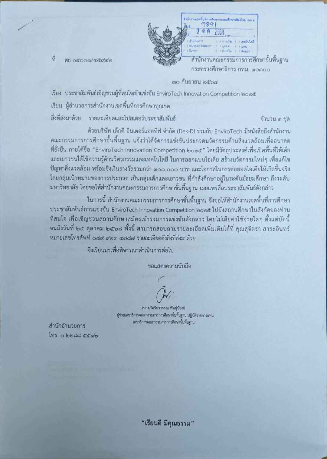 ขอเชิญชวนโรงเรียนในสังกัดเข้าร่วมการแข่งขัน “”ประชาสัมพันธ์เชิญชวนผู้ที่สนใจเข้าแข่งขัน Envirfo Tech Innovation Competition 2025” เพื่อเปิดพื้นที่ให้เด็กและเยาวชนได้ใช้ความรู้ด้านวิศวกรรมและเทคโนโลยีในการออกแบบไอเดีย ตั้งแต่บัดนี้จนถึงันที่ 25 ตุลาคม 2568 รายละเอียดตามเอกสารแนบมาพร้อมนี้