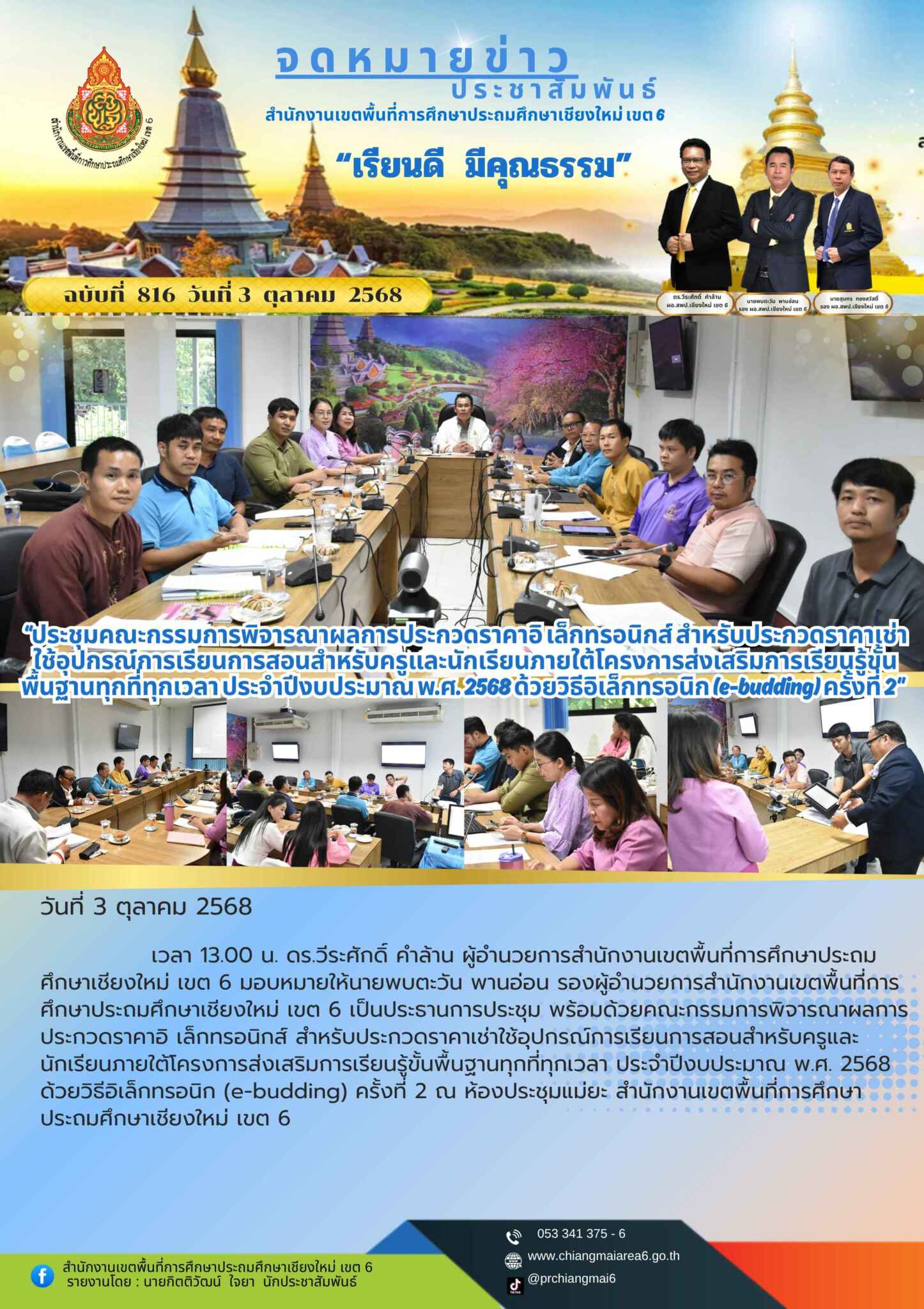 วันที่ 3 ตุลาคม 2568 เวลา 13.00 น. ดร.วีระศักดิ์ คำล้าน ผู้อำนวยการสำนักงานเขตพื้นที่การศึกษาประถมศึกษาเชียงใหม่ เขต 6 มอบหมายให้นายพบตะวัน พานอ่อน รองผู้อำนวยการสำนักงานเขตพื้นที่การศึกษาประถมศึกษาเชียงใหม่ เขต 6 เป็นประธานการประชุม พร้อมด้วยคณะกรรมการพิจารณาผลการประกวดราคาอิ เล็กทรอนิกส์ สำหรับประกวดราคาเช่าใช้อุปกรณ์การเรียนการสอนสำหรับครูและนักเรียนภายใต้โครงการส่งเสริมการเรียนรู้ขั้นพื้นฐานทุกที่ทุกเวลา ประจำปีงบประมาณ พ.ศ. 2568 ด้วยวิธีอิเล็กทรอนิก (e-budding) ครั้งที่ 2 ณ ห้องประชุมแม่ยะ สำนักงานเขตพื้นที่การศึกษาประถมศึกษาเชียงใหม่ เขต 6