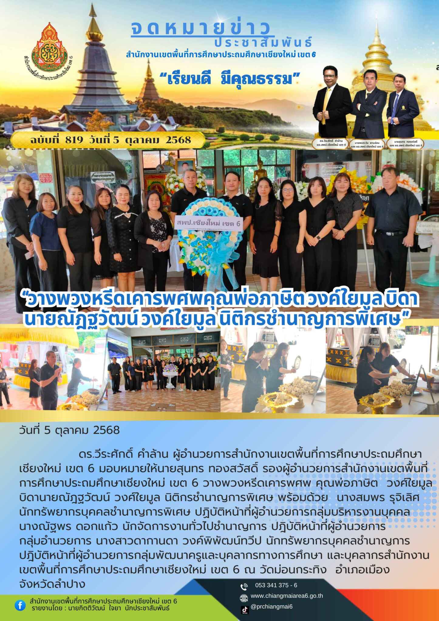 ดร.วีระศักดิ์ คำล้าน ผู้อำนวยการสำนักงานเขตพื้นที่การศึกษาประถมศึกษาเชียงใหม่ เขต 6 มอบหมายให้นายสุนทร ทองสวัสดิ์ รองผู้อำนวยการสำนักงานเขตพื้นที่การศึกษาประถมศึกษาเชียงใหม่ เขต 6 วางพวงหรีดเคารพศพคุณพ่อภาษิต วงค์ใยมูล บิดานายณัฎฐวัฒน์ วงค์ใยมูล นิติกรชำนาญการพิเศษ พร้อมด้วยนางสมพร รุจิเลิศ นักทรัพยากรบุคคลชำนาญการพิเศษ ปฏิบัติหน้าที่ผู้อำนวยการกลุ่มบริหารงานบุคคล นางณัฐพร ดอกแก้ว นักจัดการงานทั่วไปชำนาญการ ปฎิบัติหน้าที่ผู้อำนวยการกลุ่มอำนวยการ นางสาวดากานดา วงค์พิพัฒน์ทวีป นักทรัพยากรบุคคลชำนาญการ ปฎิบัติหน้าที่ผู้อำนวยการกลุ่มพัฒนาครูและบุคลากรทางการศึกษา และบุคลากรสำนักงานเขตพื้นที่การศึกษาประถมศึกษาเชียงใหม่ เขต 6 ณ วัดม่อนกระทิง ศาลา อำเภอเมือง จังหวัดลำปาง