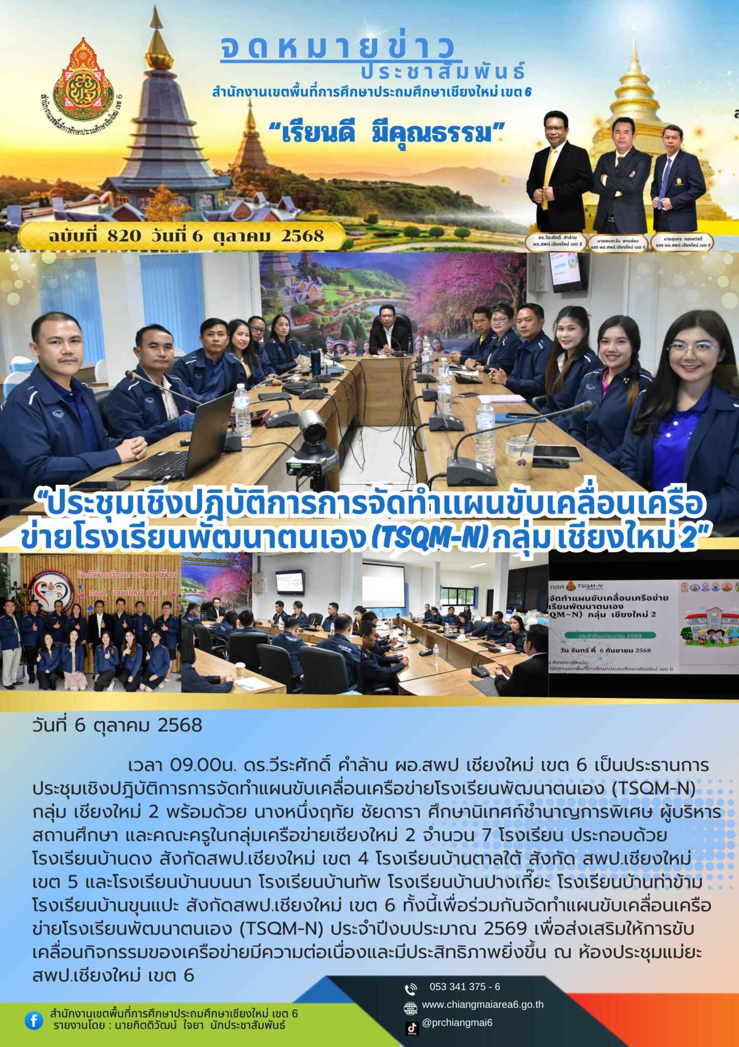 วันที่ 6 ตุลาคม 2568 เวลา 09.00น. ดร.วีระศักดิ์ คำล้าน ผอ.สพป เชียงใหม่ เขต 6 เป็นประธานการประชุมเชิงปฎิบัติการการจัดทำแผนขับเคลื่อนเครือข่ายโรงเรียนพัฒนาตนเอง (TSQM-N) กลุ่ม เชียงใหม่ 2 พร้อมด้วย นางหนึ่งฤทัย ชัยดารา ศึกษานิเทศก์ชำนาญการพิเศษ ผู้บริหารสถานศึกษา และคณะครูในกลุ่มเครือข่ายเชียงใหม่ 2 จำนวน 7 โรงเรียน ประกอบด้วย โรงเรียนบ้านดง สังกัดสพป.เชียงใหม่ เขต 4 โรงเรียนบ้านตาลใต้ สังกัด สพป.เชียงใหม่ เขต 5 และโรงเรียนบ้านบนนา โรงเรียนบ้านทัพ โรงเรียนบ้านปางเกี๊ยะ โรงเรียนบ้านท่าข้าม โรงเรียนบ้านขุนแปะ สังกัดสพป.เชียงใหม่ เขต 6 ทั้งนี้เพื่อร่วมกันจัดทำแผนขับเคลื่อนเครือข่ายโรงเรียนพัฒนาตนเอง (TSQM-N) ประจำปีงบประมาณ 2569เพื่อส่งเสริมให้การขับเคลื่อนกิจกรรมของเครือข่ายมีความต่อเนื่องและมีประสิทธิภาพยิ่งขึ้น ณ ห้องประชุมแม่ยะ สพป.เชียงใหม่ เขต 6