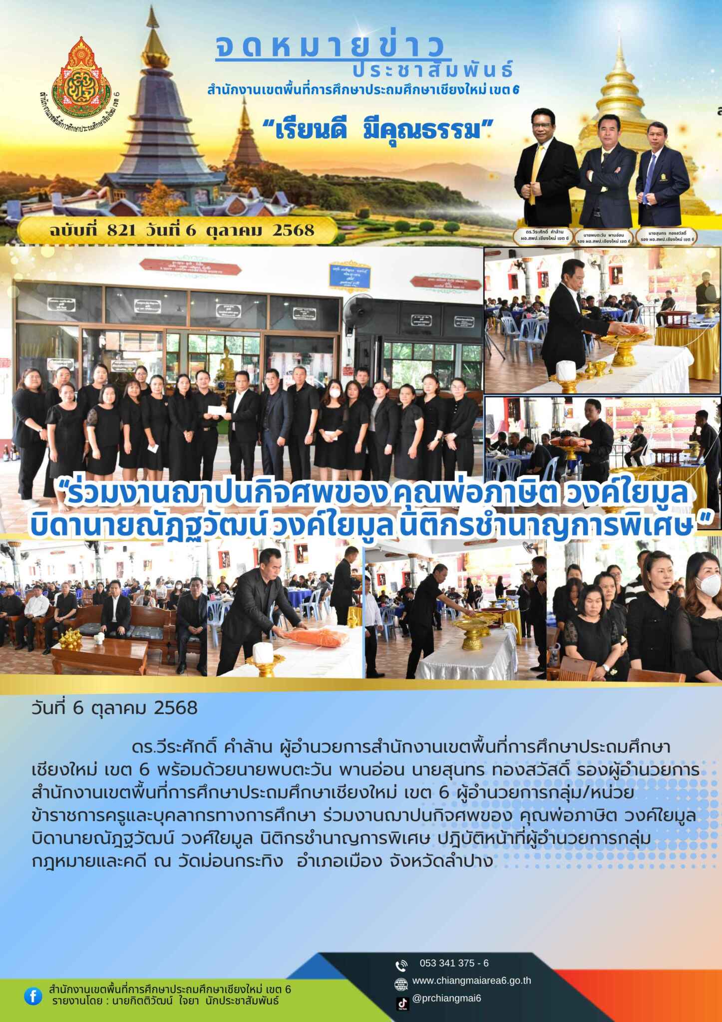 วันที่ 6 ตุลาคม 2568 ดร.วีระศักดิ์ คำล้าน ผู้อำนวยการสำนักงานเขตพื้นที่การศึกษาประถมศึกษาเชียงใหม่ เขต 6 พร้อมด้วยนายพบตะวัน พานอ่อน นายสุนทร ทองสวัสดิ์ รองผู้อำนวยการสำนักงานเขตพื้นที่การศึกษาประถมศึกษาเชียงใหม่ เขต 6 ผู้อำนวยการกลุ่ม/หน่วย ข้าราชการครูและบุคลากรทางการศึกษา ร่วมงานฌาปนกิจศพของ คุณพ่อภาษิต วงค์ใยมูล บิดานายณัฎฐวัฒน์ วงค์ใยมูล นิติกรชำนาญการพิเศษ ปฎิบัติหน้าที่ผู้อำนวยการกลุ่มกฎหมายและคดี ณ วัดม่อนกระทิง ศาลา อำเภอเมือง จังหวัดลำปาง