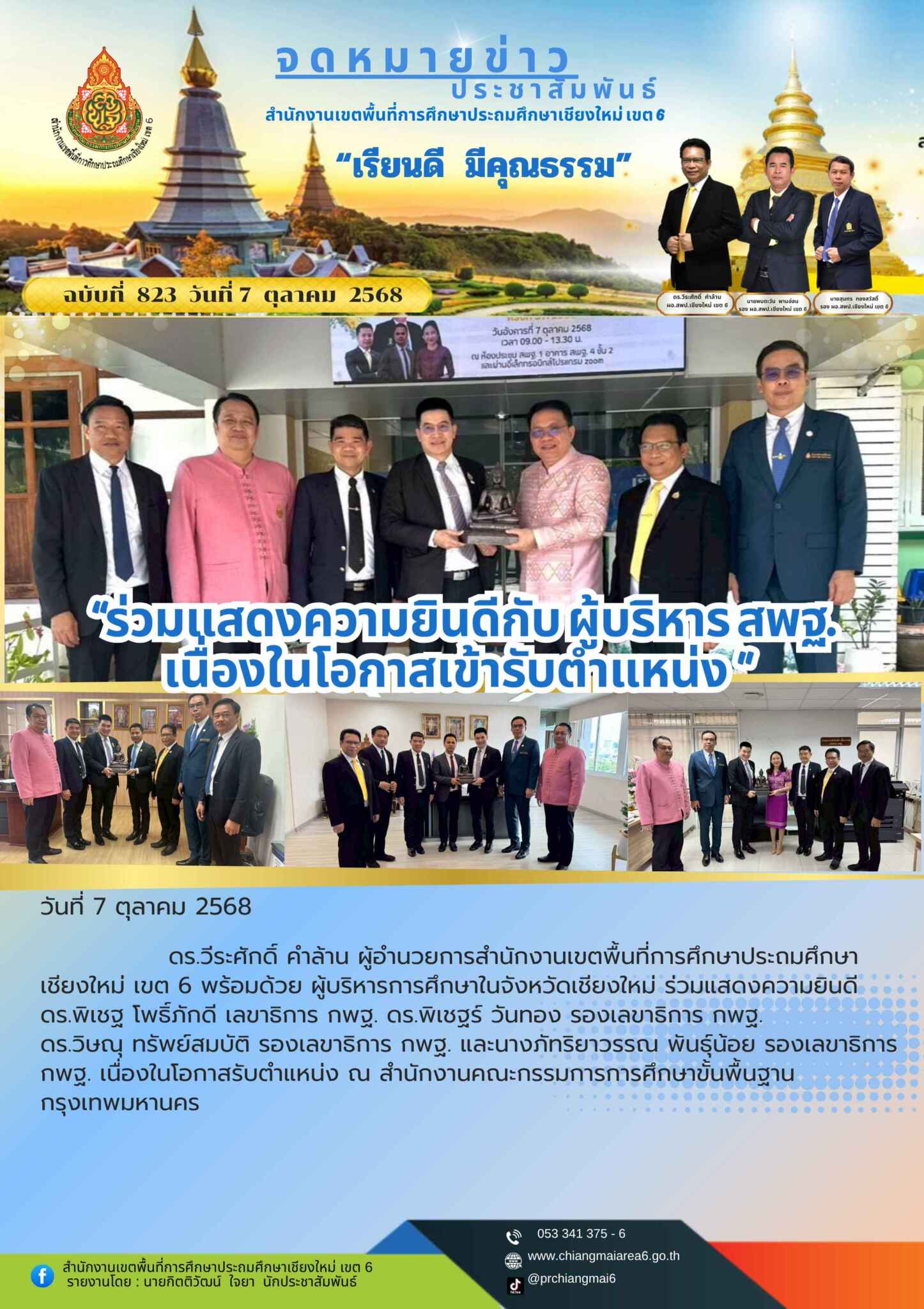 วันที่ 7 ตุลาคม 2568 ดร.วีระศักดิ์ คำล้าน ผู้อำนวยการสำนักงานเขตพื้นที่การศึกษาประถมศึกษาเชียงใหม่ เขต 6 พร้อมด้วย ผู้บริหารการศึกษาในจังหวัดเชียงใหม่ ร่วมแสดงความยินดี ดร.พิเชฐ โพธิ์ภักดี เลขาธิการ กพฐ. ดร.พิเชฐร์ วันทอง รองเลขาธิการ กพฐ. ดร.วิษณุ ทรัพย์สมบัติ รองเลขาธิการ กพฐ. และนางภัทริยาวรรณ พันธุ์น้อย รองเลขาธิการ กพฐ. เนื่องในโอกาสรับตำแหน่ง ณ สำนักงานคณะกรรมการการศึกษาขั้นพื้นฐาน กรุงเทพมหานคร
