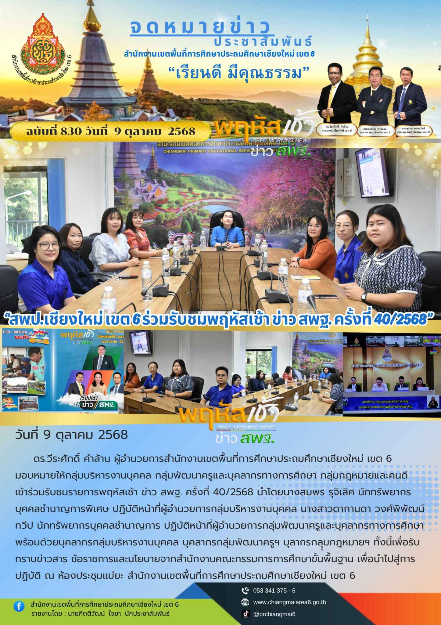 วันที่ 9 ตุลาคม 2568 เวลา 08.30 น. ดร.วีระศักดิ์ คำล้าน ผู้อำนวยการสำนักงานเขตพื้นที่การศึกษาประถมศึกษาเชียงใหม่ เขต 6 มอบหมายให้กลุ่มบริหารงานบุคคล กลุ่มพัฒนาครูและบุคลากรทางการศึกษา กลุ่มกฎหมายและคนดี เข้าร่วมรับชมรายการพฤหัสเช้า ข่าว สพฐ. ครั้งที่ 40/2568 นำโดยนางสมพร รุจิเลิศ นักทรัพยากรบุคคลชำนาญการพิเศษ ปฏิบัติหน้าที่ผู้อำนวยการกลุ่มบริหารงานบุคคล นางสาวดากานดา วงศ์พิพัฒน์ทวีป นักทรัพยากรบุคคลชำนาญการ ปฏิบัติหน้าที่ผู้อำนวยการกลุ่มพัฒนาครูและบุคลากรทางการศึกษา พร้อมด้วยบุคลากรกลุ่มบริหารงานบุคคล บุคลากรกลุ่มพัฒนาครูฯ บุลากรกลุุมกฎหมายฯ ทั้งนี้เพื่อรับทราบข่าวสาร ข้อราชการและนโยบายจากสำนักงานคณะกรรมการการศึกษาขั้นพื้นฐาน เพื่อนำไปสู่การปฏิบัติ ณ ห้องประชุมแม่ยะ สำนักงานเขตพื้นที่การศึกษาประถมศึกษาเชียงใหม่ เขต 6