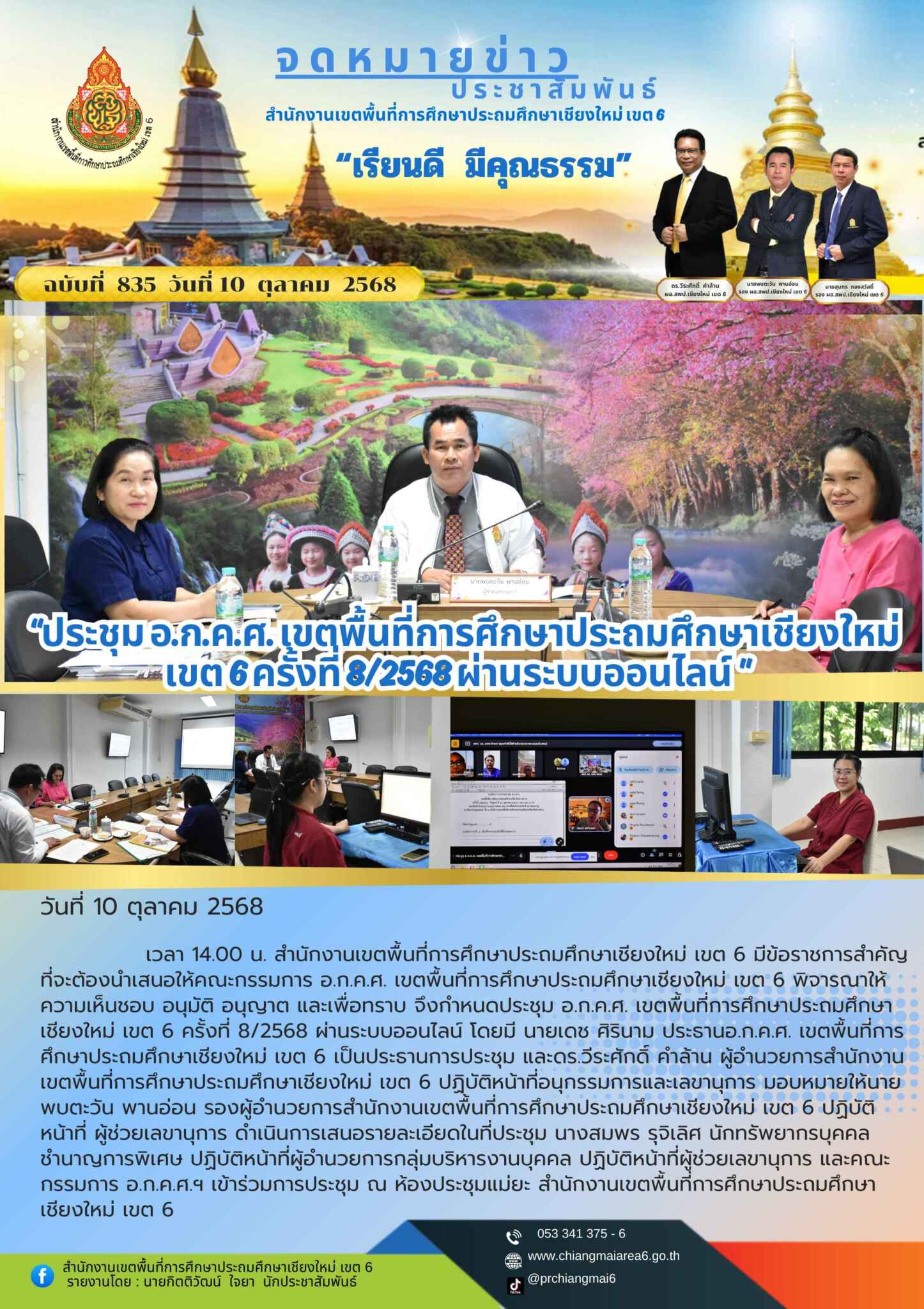 วันที่ 10 ตุลาคม 2568 เวลา 14.00 น. สำนักงานเขตพื้นที่การศึกษาประถมศึกษาเชียงใหม่ เขต 6 มีข้อราชการสำคัญที่จะต้องนำเสนอให้คณะกรรมการ อ.ก.ค.ศ. เขตพื้นที่การศึกษาประถมศึกษาเชียงใหม่ เขต 6 พิจารณาให้ความเห็นชอบ อนุมัติ อนุญาต และเพื่อทราบ จึงกำหนดประชุม อ.ก.ค.ศ. เขตพื้นที่การศึกษาประถมศึกษาเชียงใหม่ เขต 6 ครั้งที่ 8/2568 ผ่านระบบออนไลน์ โดยมี นายเดช ศิรินาม ประธานอ.ก.ค.ศ. เขตพื้นที่การศึกษาประถมศึกษาเชียงใหม่ เขต 6 เป็นประธานการประชุม และดร.วีระศักดิ์ คำล้าน ผู้อำนวยการสำนักงานเขตพื้นที่การศึกษาประถมศึกษาเชียงใหม่ เขต 6 ปฏิบัติหน้าที่อนุกรรมการและเลขานุการ มอบหมายให้นายพบตะวัน พานอ่อน รองผู้อำนวยการสำนักงานเขตพื้นที่การศึกษาประถมศึกษาเชียงใหม่ เขต 6 ปฏิบัติหน้าที่ ผู้ช่วยเลขานุการ ดำเนินการเสนอรายละเอียดในที่ประชุม นางสมพร รุจิเลิศ นักทรัพยากรบุคคลชำนาญการพิเศษ ปฏิบัติหน้าที่ผู้อำนวยการกลุ่มบริหารงานบุคคล ปฏิบัติหน้าที่ผู้ช่วยเลขานุการ และคณะกรรมการ อ.ก.ค.ศ.ฯ เข้าร่วมการประชุม ณ ห้องประชุมแม่ยะ สำนักงานเขตพื้นที่การศึกษาประถมศึกษาเชียงใหม่ เขต 6