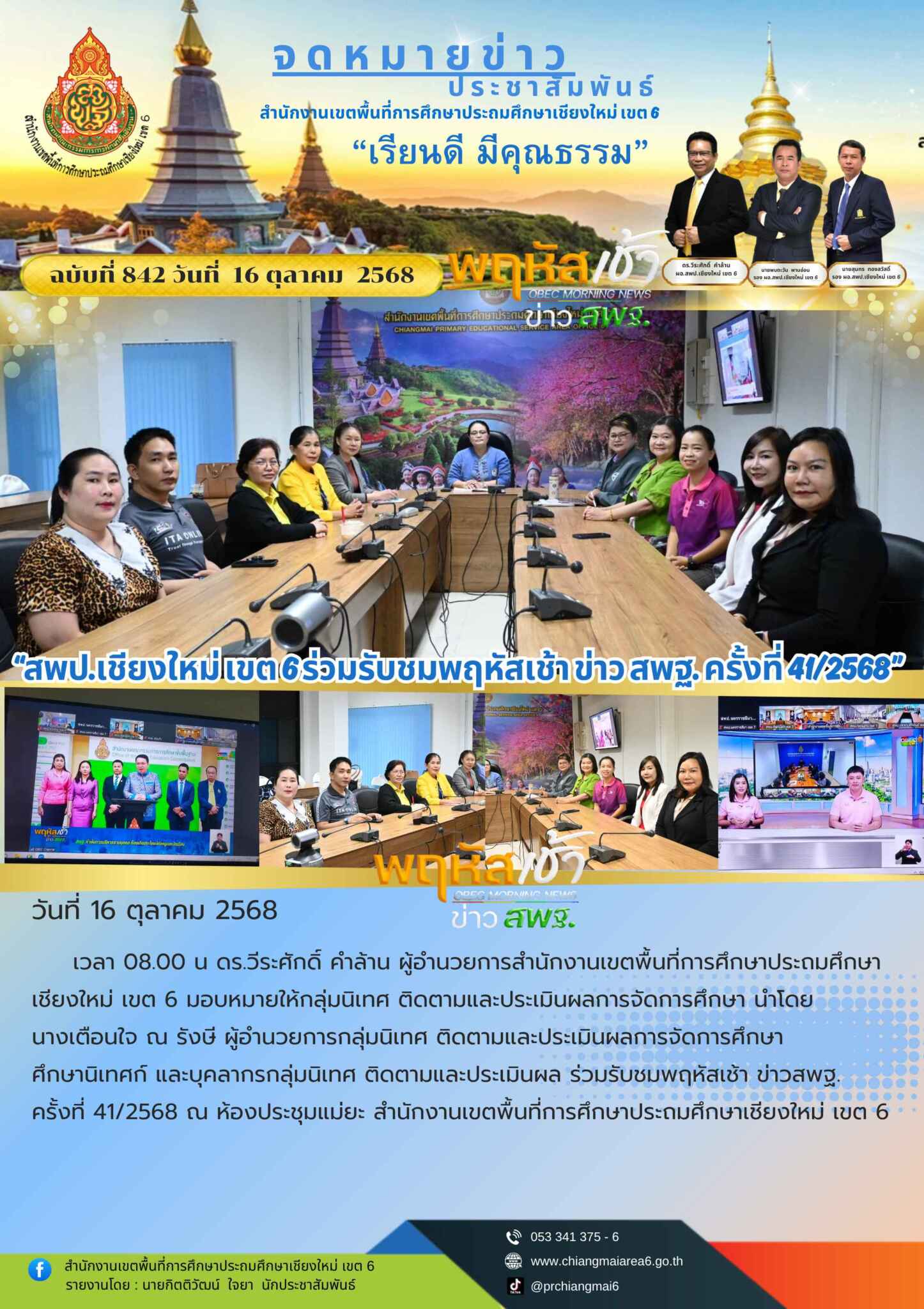 วันที่ 16 ตุลาคม 2568 เวลา 08.00 น ดร.วีระศักดิ์ คำล้าน ผู้อำนวยการสำนักงานเขตพื้นที่การศึกษาประถมศึกษาเชียงใหม่ เขต 6 มอบหมายให้กลุ่มนิเทศ ติดตามและประเมินผลการจัดการศึกษา นำโดย นางเตือนใจ ณ รังษี ผู้อำนวยการกลุ่มนิเทศ ติดตามและประเมินผลการจัดการศึกษา ศึกษานิเทศก์ และบุคลากรกลุ่มนิเทศ ติดตามและประเมินผล ร่วมรับชมพฤหัสเช้า ข่าวสพฐ. ครั้งที่ 41/2568 ณ ห้องประชุมแม่ยะ สำนักงานเขตพื้นที่การศึกษาประถมศึกษาเชียงใหม่ เขต 6