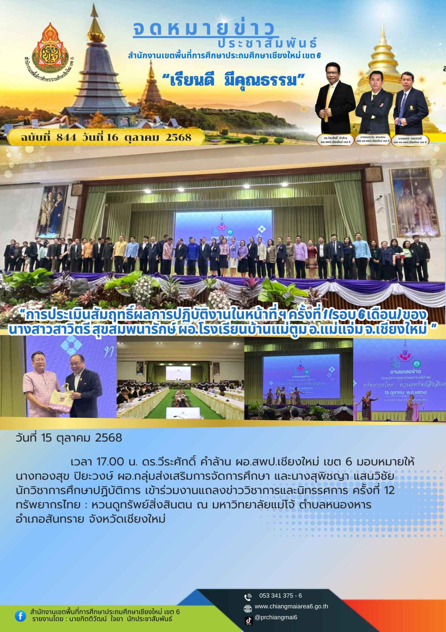 วันที่ 15 ตุลาคม 2568 เวลา 17.00 น. ดร.วีระศักดิ์ คำล้าน ผอ.สพป.เชียงใหม่ เขต 6 มอบหมายให้ นางทองสุข ปิยะวงษ์ ผอ.กลุ่มส่งเสริมการจัดการศึกษา และนางสุพิชญา แสนวิชัย นักวิชาการศึกษาปฏิบัติการ เข้าร่วมงานแถลงข่าววิชาการและนิทรรศการ ครั้งที่ 12 ทรัพยากรไทย : หวนดูทรัพย์สิ่งสินตน ณ มหาวิทยาลัยแม่โจ้ ตำบลหนองหาร อำเภอสันทราย จังหวัดเชียงใหม่