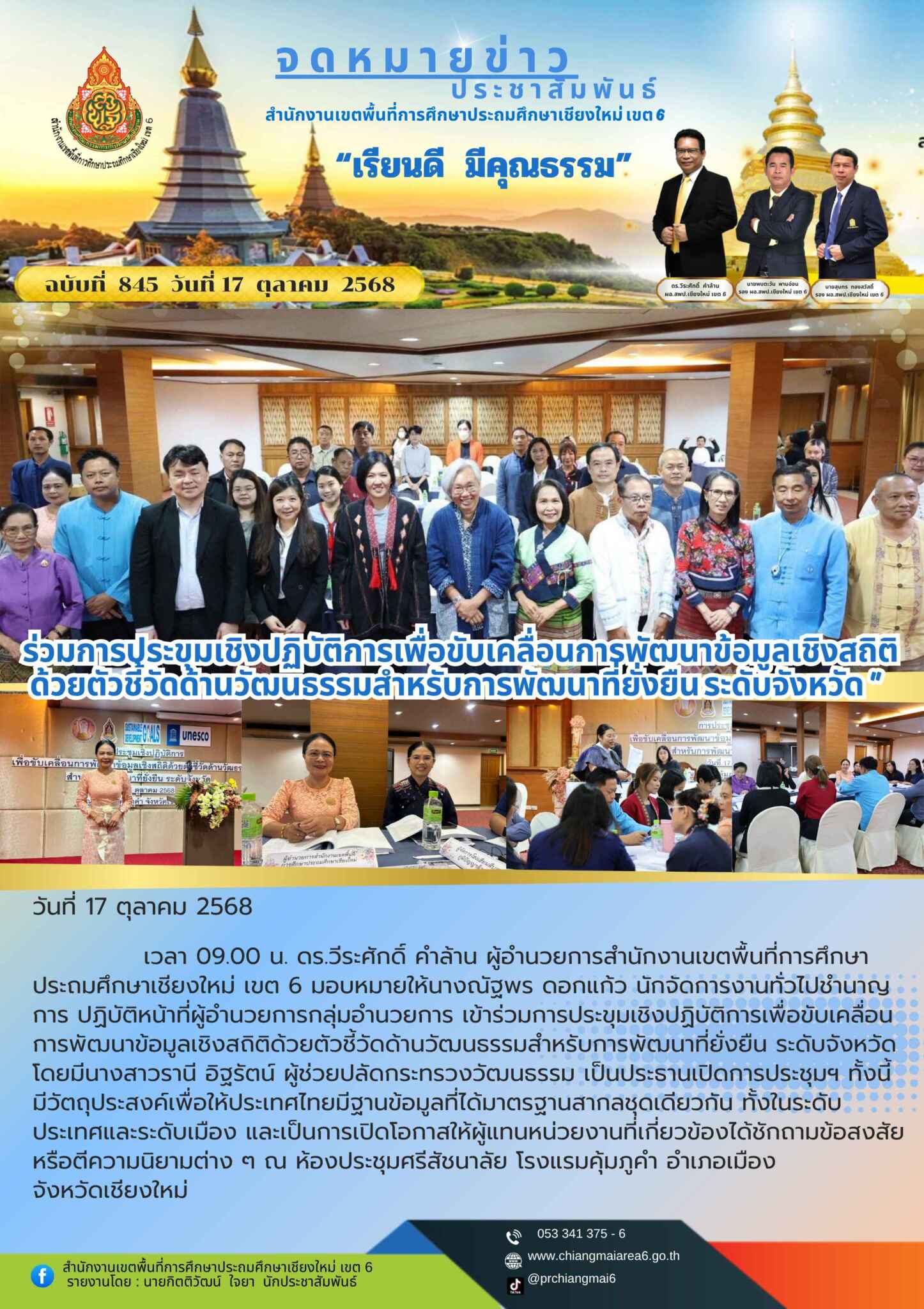 วันที่ 17 ตุลาคม 2568 เวลา 09.00 น. ดร.วีระศักดิ์ คำล้าน ผู้อำนวยการสำนักงานเขตพื้นที่การศึกษาประถมศึกษาเชียงใหม่ เขต 6 มอบหมายให้นางณัฐพร ดอกแก้ว นักจัดการงานทั่วไปชำนาญการ ปฏิบัติหน้าที่ผู้อำนวยการกลุ่มอำนวยการ เข้าร่วมการประขุมเชิงปฏิบัติการเพื่อขับเคลื่อนการพัฒนาข้อมูลเชิงสถิติด้วยตัวชี้วัดด้านวัฒนธรรมสำหรับการพัฒนาที่ยั่งยืน ระดับจังหวัด โดยมีนางสาวรานี อิฐรัตน์ ผู้ช่วยปลัดกระทรวงวัฒนธรรม เป็นประธานเปิดการประชุมฯ ทั้งนี้ มีวัตถุประสงค์เพื่อให้ประเทศไทยมีฐานข้อมูลที่ได้มาตรฐานสากลชุดเดียวกัน ทั้งในระดับประเทศและระดับเมือง และเป็นการเปิดโอกาสให้ผู้แทนหน่วยงานที่เกี่ยวข้องได้ชักถามข้อสงสัยหรือตีความนิยามต่าง ๆ ณ ห้องประชุมศรีสัชนาลัย โรงแรมคุ้มภูคำ อำเภอเมือง จังหวัดเชียงใหม่