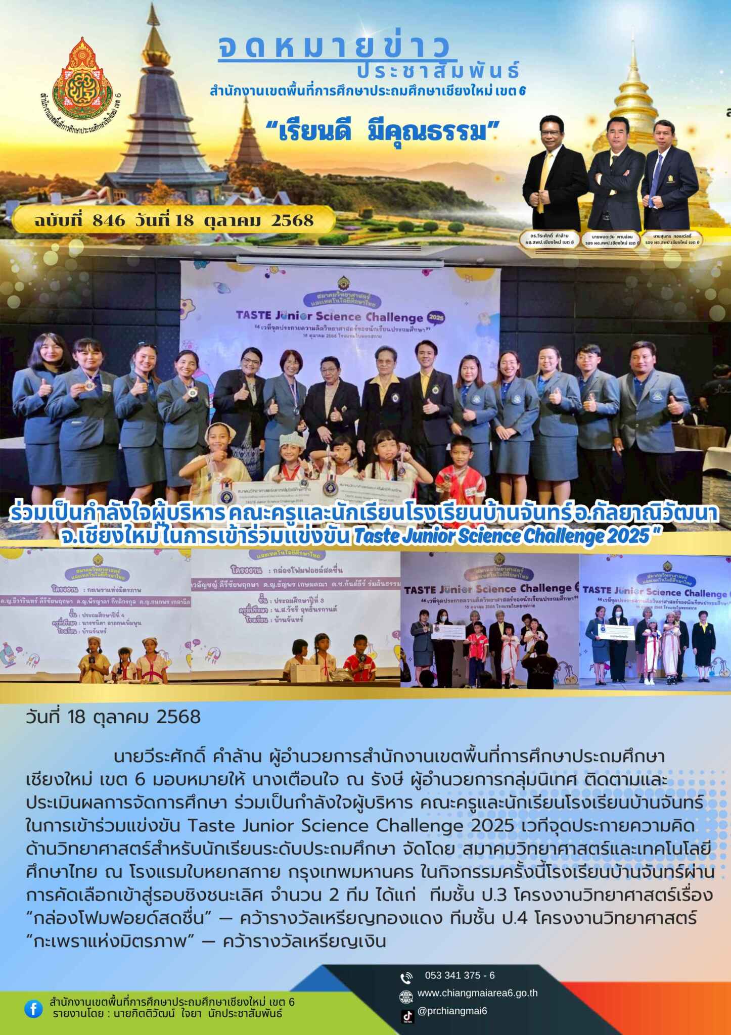 วันที่ 18 ตุลาคม 2568 นายวีระศักดิ์ คำล้าน ผู้อำนวยการสำนักงานเขตพื้นที่การศึกษาประถมศึกษาเชียงใหม่ เขต 6 มอบหมายให้นางเตือนใจ ณ รังษี ผู้อำนวยการกลุ่มนิเทศ ติดตามและประเมินผลการจัดการศึกษา ร่วมเป็นกำลังใจผู้บริหาร คณะครูและนักเรียนโรงเรียนบ้านจันทร์ ในการเข้าร่วมแข่งขัน Taste Junior Science Challenge 2025 เวทีจุดประกายความคิดด้านวิทยาศาสตร์สำหรับนักเรียนระดับประถมศึกษา จัดโดย สมาคมวิทยาศาสตร์และเทคโนโลยีศึกษาไทย ณ โรงแรมใบหยกสกาย กรุงเทพมหานคร