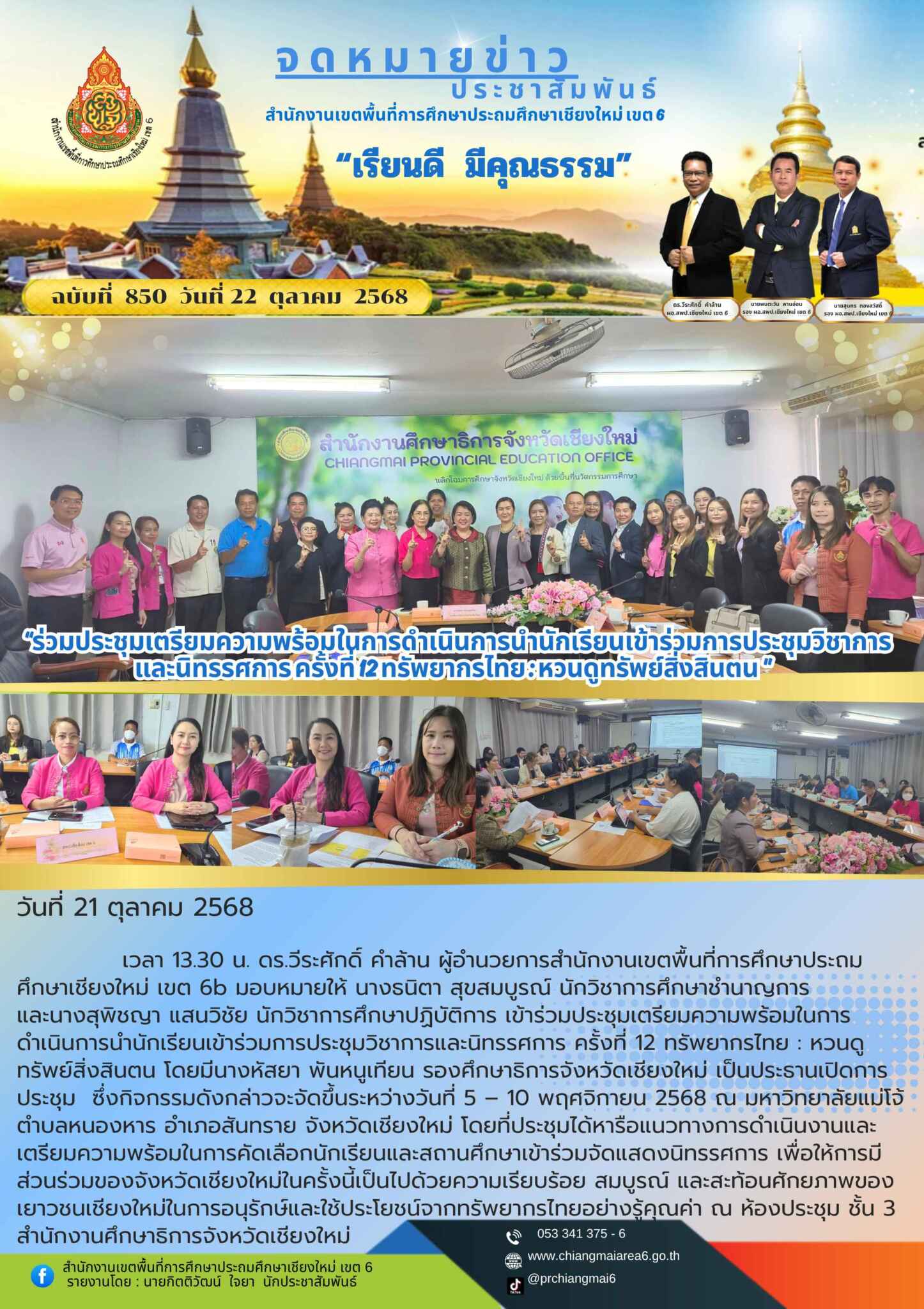 วันที่ 21 ตุลาคม 2568 เวลา 13.30 น. ดร.วีระศักดิ์ คำล้าน ผู้อำนวยการสำนักงานเขตพื้นที่การศึกษาประถมศึกษาเชียงใหม่ เขต 6b มอบหมายให้ นางธนิตา สุขสมบูรณ์ นักวิชาการศึกษาชำนาญการ และนางสุพิชญา แสนวิชัย นักวิชาการศึกษาปฏิบัติการ เข้าร่วมประชุมเตรียมความพร้อมในการดำเนินการนำนักเรียนเข้าร่วมการประชุมวิชาการและนิทรรศการ ครั้งที่ 12 ทรัพยากรไทย : หวนดูทรัพย์สิ่งสินตน โดยมีนางหัสยา พันหนูเทียน รองศึกษาธิการจังหวัดเชียงใหม่ เป็นประธาน ซึ่งกิจกรรมดังกล่าวจะจัดขึ้นระหว่างวันที่ 5 – 10 พฤศจิกายน 2568 ณ มหาวิทยาลัยแม่โจ้ ตำบลหนองหาร อำเภอสันทราย จังหวัดเชียงใหม่ โดยที่ประชุมได้หารือแนวทางการดำเนินงานและเตรียมความพร้อมในการคัดเลือกนักเรียนและสถานศึกษาเข้าร่วมจัดแสดงนิทรรศการ เพื่อให้การมีส่วนร่วมของจังหวัดเชียงใหม่ในครั้งนี้เป็นไปด้วยความเรียบร้อย สมบูรณ์ และสะท้อนศักยภาพของเยาวชนเชียงใหม่ในการอนุรักษ์และใช้ประโยชน์จากทรัพยากรไทยอย่างรู้คุณค่า ณ ห้องประชุม ชั้น 3 สำนักงานศึกษาธิการจังหวัดเชียงใหม่