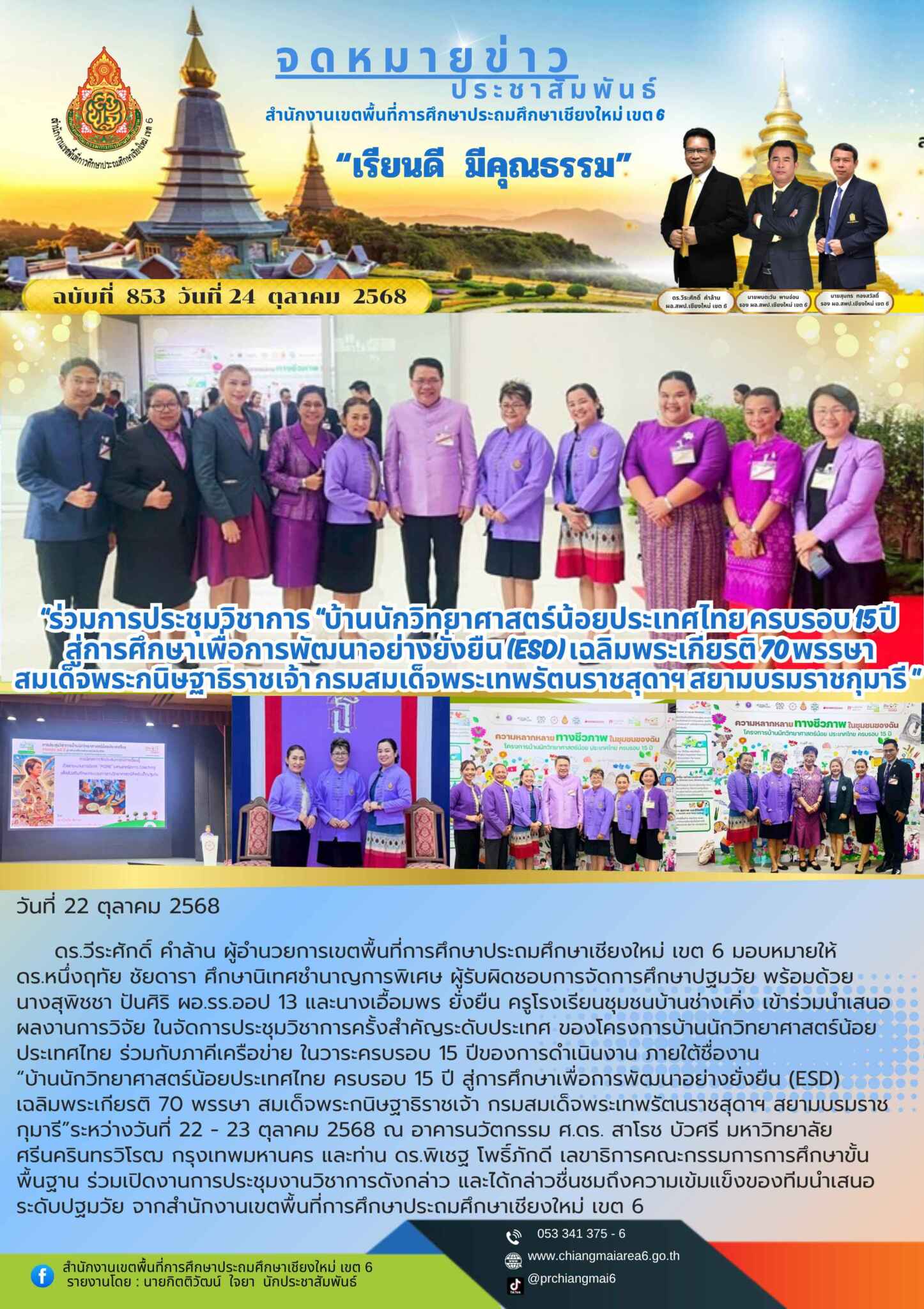 วันที่ 22 ตุลาคม 2568 ดร.วีระศักดิ์ คำล้าน ผู้อำนวยการเขตพื้นที่การศึกษาประถมศึกษาเชียงใหม่ เขต 6 มอบหมายให้ ดร.หนึ่งฤทัย ชัยดารา ศึกษานิเทศชำนาญการพิเศษ ผู้รับผิดชอบการจัดการศึกษาปฐมวัย พร้อมด้วย นางสุพิชชา ปันศิริ ผอ.รร.ออป 13 และนางเอื้อมพร ยั่งยืน ครูโรงเรียนชุมชนบ้านช่างเคิ่ง เข้าร่วมนำเสนอผลงานการวิจัย ในจัดการประชุมวิชาการครั้งสำคัญระดับประเทศ ของโครงการบ้านนักวิทยาศาสตร์น้อย ประเทศไทย ร่วมกับภาคีเครือข่าย ในวาระครบรอบ 15 ปีของการดำเนินงาน ภายใต้ชื่องาน “บ้านนักวิทยาศาสตร์น้อยประเทศไทย ครบรอบ 15 ปี สู่การศึกษาเพื่อการพัฒนาอย่างยั่งยืน (ESD) เฉลิมพระเกียรติ 70 พรรษา สมเด็จพระกนิษฐาธิราชเจ้า กรมสมเด็จพระเทพรัตนราชสุดาฯ สยามบรมราชกุมารี”ระหว่างวันที่ 22 – 23 ตุลาคม 2568 ณ อาคารนวัตกรรม ศ. ดร. สาโรช บัวศรี มหาวิทยาลัยศรีนครินทรวิโรฒ กรุงเทพมหานคร และท่าน ดร.พิเชฐ โพธิ์ภักดี เลขาธิการคณะกรรมการการศึกษาขั้นพื้นฐาน ร่วมเปิดงานการประชุมงานวิชาการดังกล่าว และได้กล่าวชื่นชมถึงความเข้มแข็งของทีมนำเสนอระดับปฐมวัย จากสำนักงานเขตพื้นที่การศึกษาประถมศึกษาเชียงใหม่ เขต 6
