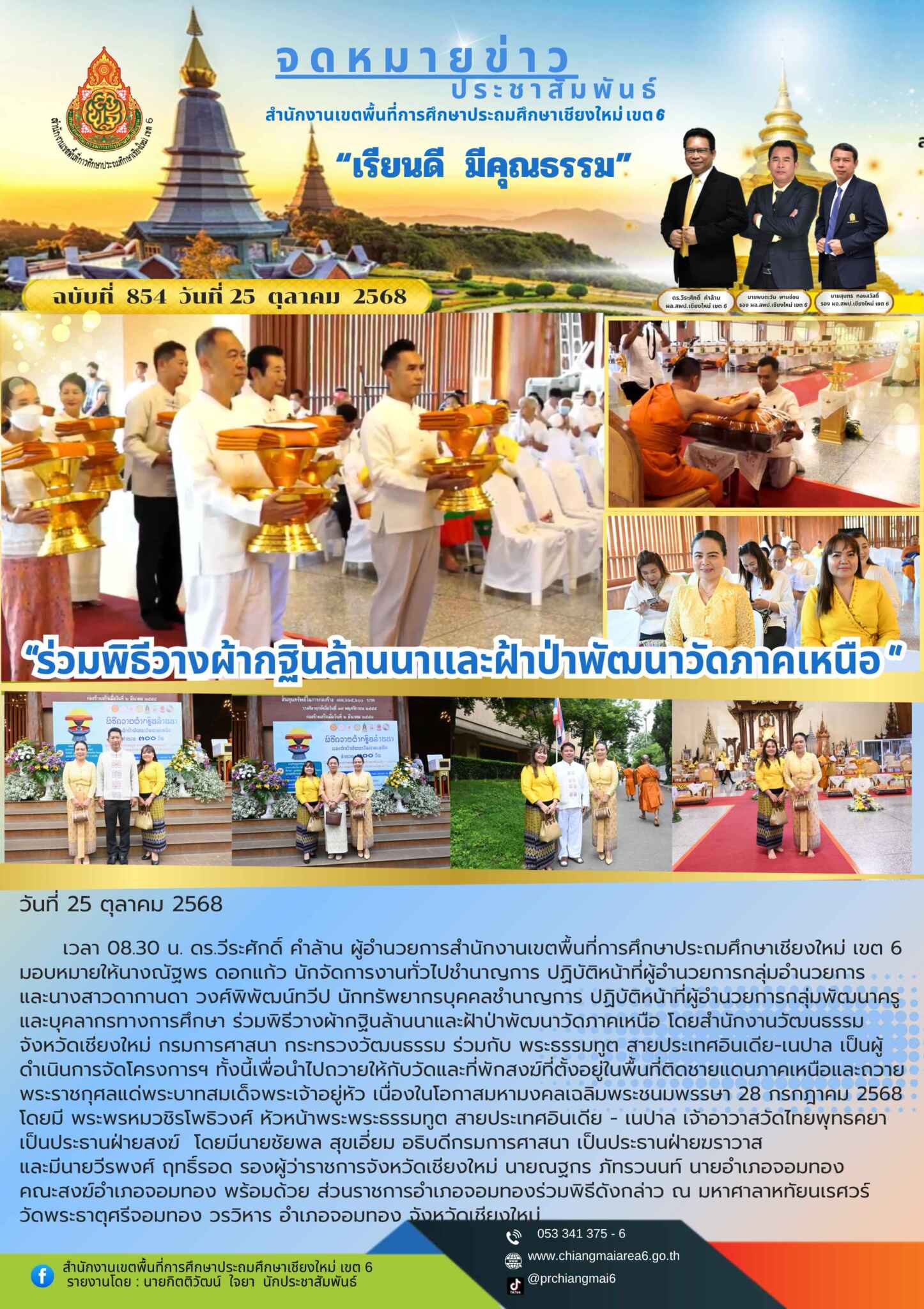วันที่ 25 ตุลาคม 2568 เวลา 08.30 น. ดร.วีระศักดิ์ คำล้าน ผู้อำนวยการสำนักงานเขตพื้นที่การศึกษาประถมศึกษาเชียงใหม่ เขต 6 มอบหมายให้นางณัฐพร ดอกแก้ว นักจัดการงานทั่วไปชำนาญการ ปฏิบัติหน้าที่ผู้อำนวยการกลุ่มอำนวยการ และนางสาวดากานดา วงศ์พิพัฒน์ทวีป นักทรัพยากรบุคคลชำนาญการ ปฏิบัติหน้าที่ผู้อำนวยการกลุ่มพัฒนาครูและบุคลากรทางการศึกษา ร่วมพิธีวางผ้ากฐินล้านนาและฝ้าป่าพัฒนาวัดภาคเหนือ โดยสำนักงานวัฒนธรรมจังหวัดเชียงใหม่ กรมการศาสนา กระทรวงวัฒนธรรม ร่วมกับ พระธรรมทูต สายประเทศอินเดีย-เนปาล เป็นผู้ดำเนินการจัดโครงการฯ ทั้งนี้เพื่อนำไปถวายให้กับวัดและที่พักสงฆ์ที่ตั้งอยู่ในพื้นที่ติดชายแดนภาคเหนือและถวายพระราชกุศลแด่พระบาทสมเด็จพระเจ้าอยู่หัว เนื่องในโอกาสมหามงคลเฉลิมพระชนมพรรษา 28 กรกฎาคม 2568 โดยมี พระพรหมวชิรโพธิวงศ์ หัวหน้าพระพระธรรมทูต สายประเทศอินเดีย – เนปาล เจ้าอาวาสวัดไทยพุทธคยาเป็นประธานฝ่ายสงฆ์โดยมีนายชัยพล สุขเอี่ยม อธิบดีกรมการศาสนา เป็นประธานฝ่ายฆราวาส และมีนายวีรพงศ์ ฤทธิ์รอด รองผู้ว่าราชการจังหวัดเชียงใหม่ นายณฐกร ภัทรวนนท์ นายอำเภอจอมทอง คณะสงฆ์อำเภอจอมทอง พร้อมด้วย ส่วนราชการอำเภอจอมทองร่วมพิธีดังกล่าว ณ มหาศาลาหทัยนเรศวร์ วัดพระธาตุศรีจอมทอง วรวิหาร อำเภอจอมทอง จังหวัดเชียงใหม่