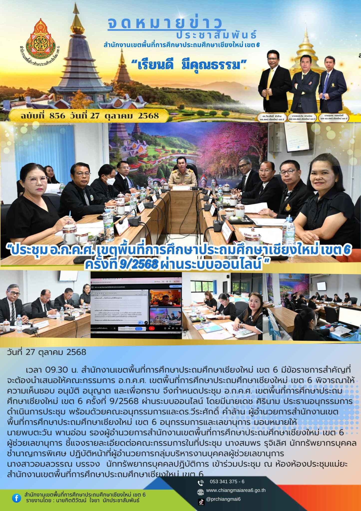 วันที่ 27 ตุลาคม 2568 เวลา 09.30 น. สำนักงานเขตพื้นที่การศึกษาประถมศึกษาเชียงใหม่ เขต 6 มีข้อราชการสำคัญที่จะต้องนำเสนอให้คณะกรรมการ อ.ก.ค.ศ. เขตพื้นที่การศึกษาประถมศึกษาเชียงใหม่ เขต 6 พิจารณาให้ความเห็นชอบ อนุมัติ อนุญาต และเพื่อทราบ จึงกำหนดประชุม อ.ก.ค.ศ. เขตพื้นที่การศึกษาประถมศึกษาเชียงใหม่ เขต 6 ครั้งที่ 9/2568 ผ่านระบบออนไลน์ โดยมีนายเดช ศิรินาม ประธานอนุกรรมการดำเนินการประชุม พร้อมด้วยคณะอนุกรรมการและดร.วีระศักดิ์ คำล้าน ผู้อำนวยการสำนักงานเขตพื้นที่การศึกษาประถมศึกษาเชียงใหม่ เขต 6 อนุกรรมการและเลขานุการ มอบหมายให้นายพบตะวัน พานอ่อน รองผู้อำนวยการสำนักงานเขตพื้นที่การศึกษาประถมศึกษาเชียงใหม่ เขต 6 ผู้ช่วยเลขานุการ ชี้แจงรายละเอียดต่อคณะกรรมการในที่ประชุม นางสมพร รุจิเลิศ นักทรัพยากรบุคคลชำนาญการพิเศษ ปฏิบัติหน้าที่ผู้อำนวยการกลุ่มบริหารงานบุคคลผู้ช่วยเลขานุการ นางสาวอมลวรรณ บรรจง นักทรัพยากรบุคคลปฏิบัติการ เข้าร่วมประชุม ณ ห้องห้องประชุมแม่ยะ สำนักงานเขตพื้นที่การศึกษาประถมศึกษาเชียงใหม่ เขต 6