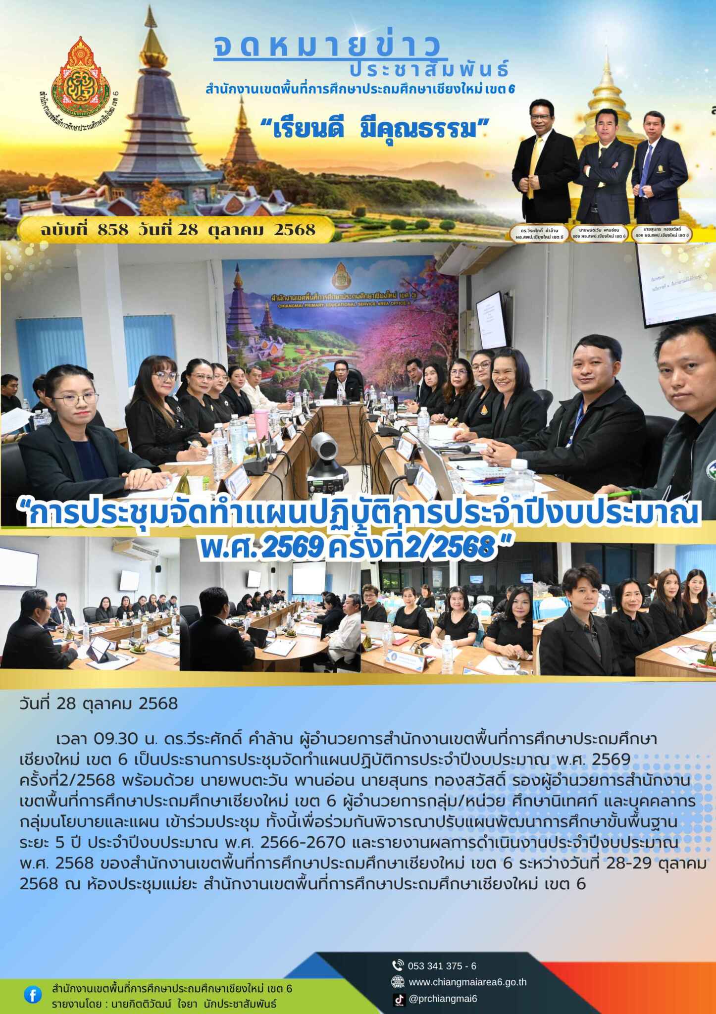 วันที่ 28 ตุลาคม 2568 เวลา 09.30 น. ดร.วีระศักดิ์ คำล้าน ผู้อำนวยการสำนักงานเขตพื้นที่การศึกษาประถมศึกษาเชียงใหม่ เขต 6 เป็นประธานการประชุมจัดทำแผนปฏิบัติการประจำปีงบประมาณ พ.ศ. 2569 ครั้งที่2/2568 พร้อมด้วย นายพบตะวัน พานอ่อน นายสุนทร ทองสวัสดิ์ รองผู้อำนวยการสำนักงานเขตพื้นที่การศึกษาประถมศึกษาเชียงใหม่ เขต 6 ผู้อำนวยการกลุ่ม/หน่วย ศึกษานิเทศก์ และบุคคลากรกลุ่มนโยบายและแผน เข้าร่วมประชุม ทั้งนี้เพื่อร่วมกันพิจารณาปรับแผนพัฒนาการศึกษาขั้นพื้นฐาน ระยะ 5 ปี ประจำปีงบประมาณ พ.ศ. 2566-2670 ของสำนักงานเขตพื้นที่การศึกษาประถมศึกษาเชียงใหม่ เขต 6 ระหว่างวันที่ 28-29 ตุลาคม 2568 ณ ห้องประชุมแม่ยะ สำนักงานเขตพื้นที่การศึกษาประถมศึกษาเชียงใหม่ เขต 6