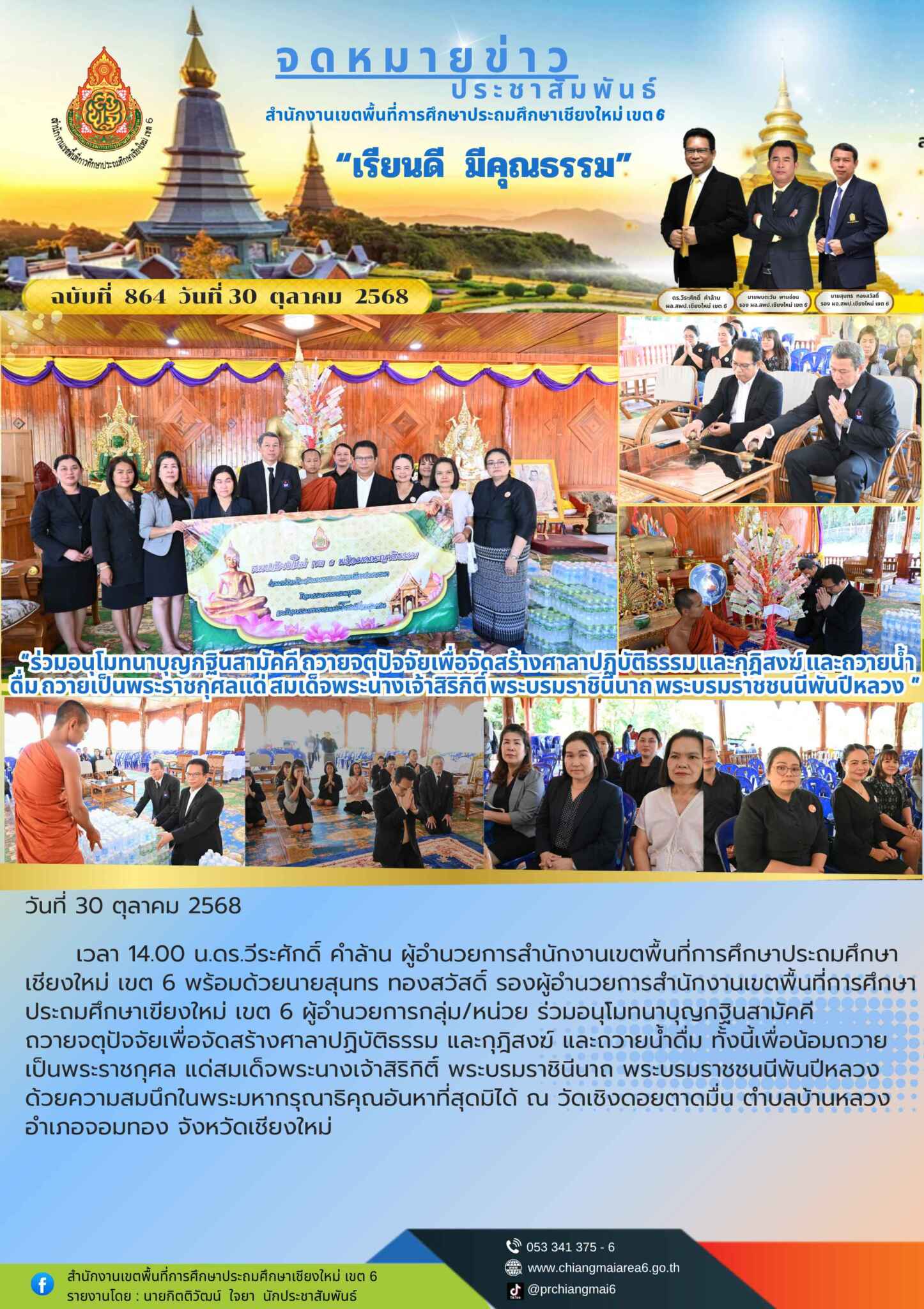 วันที่ 30 ตุลาคม 2568 เวลา 14.00 น.ดร.วีระศักดิ์ คำล้าน ผู้อำนวยการสำนักงานเขตพื้นที่การศึกษาประถมศึกษาเชียงใหม่ เขต 6 พร้อมด้วยนายสุนทร ทองสวัสดิ์ รองผู้อำนวยการสำนักงานเขตพื้นที่การศึกษาประถมศึกษาเฃียงใหม่ เขต 6 ผู้อำนวยการกลุ่ม/หน่วย ร่วมอนุโมทนาบุญกฐินสามัคคี ถวายจตุปัจจัยเพื่อจัดสร้างศาลาปฏิบัติธรรม และกุฎิสงฆ์ และถวายน้ำดื่ม ทั้งนี้เพื่อน้อมถวายเป็นพระราชกุศล แด่สมเด็จพระนางเจ้าสิริกิติ์ พระบรมราชินีนาถ พระบรมราชชนนีพันปีหลวง ด้วยความสมนึกในพระมหากรุณาธิคุณอันหาที่สุดมิได้ ณ วัดเชิงดอยตาดมื่น ตำบลบ้านหลวง อำเภอจอมทอง จังหวัดเชียงใหม่