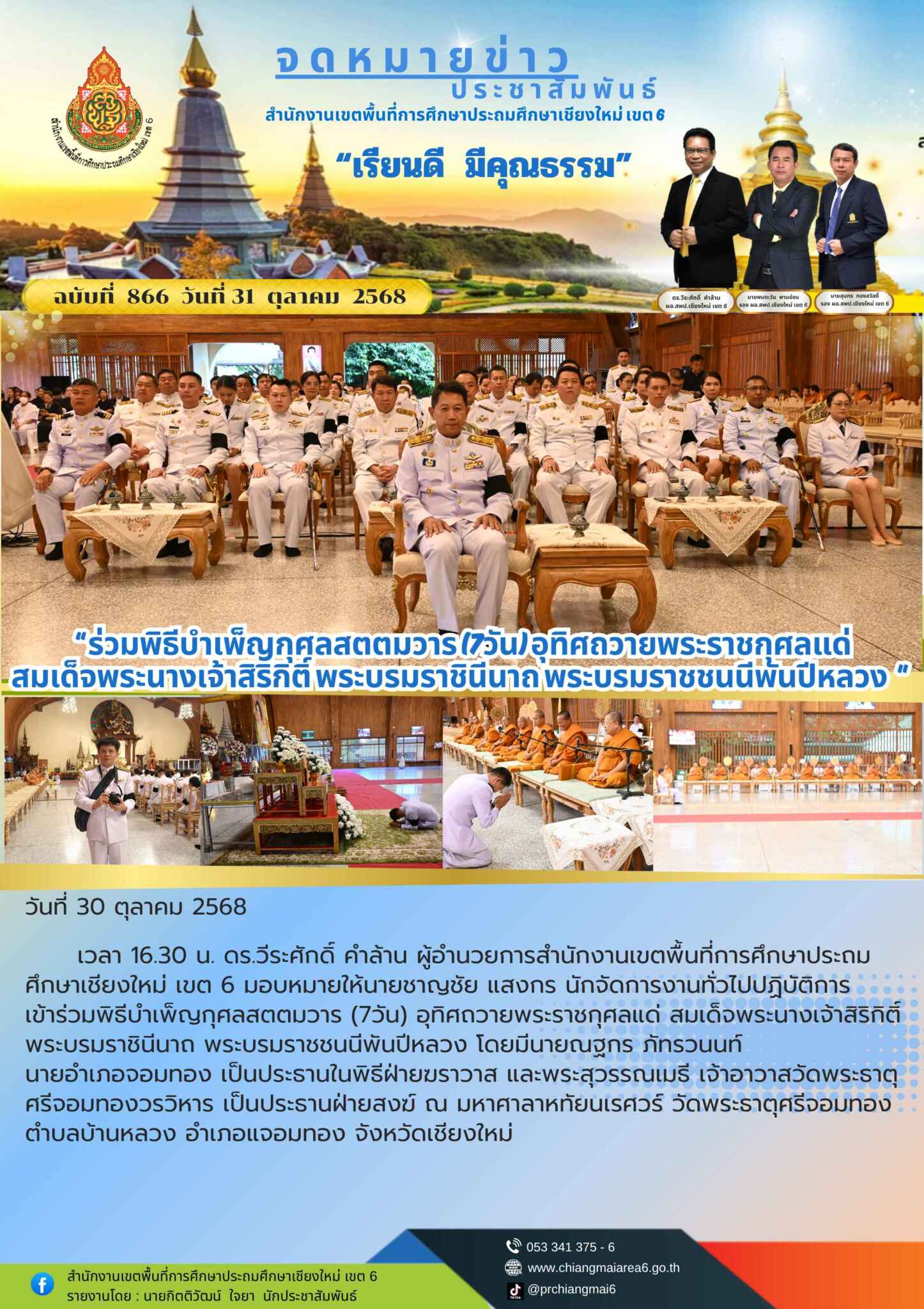วันที่ 30 ตุลาคม 2568 เวลา 16.30 น. ดร.วีระศักดิ์ คำล้าน ผู้อำนวยการสำนักงานเขตพื้นที่การศึกษาประถมศึกษาเชียงใหม่ เขต 6 มอบหมายให้นายชาญชัย แสงกร นักจัดการงานทั่วไปปฏิบัติการ เข้าร่วมพิธีบำเพ็ญกุศลสตตมวาร (7วัน) อุทิศถวายพระราชกุศลแด่ สมเด็จพระนางเจ้าสิริกิติ์ พระบรมราชินีนาถ พระบรมราชชนนีพันปีหลวง โดยมีนายณฐกร ภัทรวนนท์ นายอำเภอจอมทอง เป็นประธานในพิธีฝ่ายฆราวาส และพระสุวรรณเมธี เจ้าอาวาสวัดพระธาตุศรีจอมทองวรวิหาร เป็นประธานฝ่ายสงฆ์ ณ มหาศาลาหทัยนเรศวร์ วัดพระธาตุศรีจอมทอง ตำบลบ้านหลวง อำเภอแจอมทอง จังหวัดเชียงใหม่