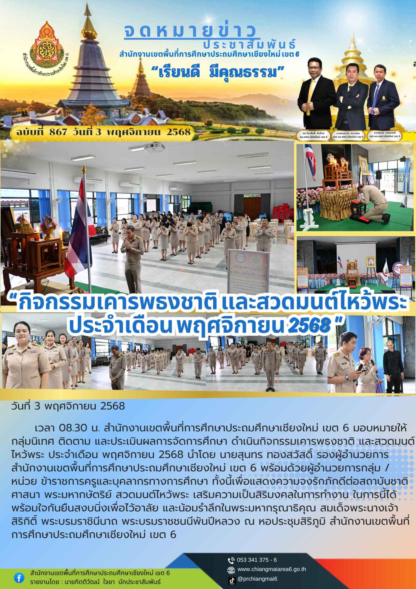 วันที่ 3 พฤศจิกายน 2568 เวลา 08.30 น. สำนักงานเขตพื้นที่การศึกษาประถมศึกษาเชียงใหม่ เขต 6 มอบหมายให้กลุ่มนิเทศ ติดตาม และประเมินผลการจัดการศึกษา ดำเนินกิจกรรมเคารพธงชาติ และสวดมนต์ไหว้พระ ประจำเดือน พฤศจิกายน 2568 นำโดย นายสุนทร ทองสวัสดิ์ รองผู้อำนวยการสำนักงานเขตพื้นที่การศึกษาประถมศึกษาเชียงใหม่ เขต 6 พร้อมด้วยผู้อำนวยการกลุ่ม /หน่วย ข้าราชการครูและบุคลากรทางการศึกษา ทั้งนี้เพื่อแสดงความจงรักภักดีต่อสถาบันชาติ ศาสนา พระมหากษัตริย์ สวดมนต์ไหว้พระ เสริมความเป็นสิริมงคลในการทำงาน ในการนี้ได้พร้อมใจกันยืนสงบนิ่งเพื่อไว้อาลัย และน้อมรำลึกในพระมหากรุณาธิคุณ สมเด็จพระนางเจ้าสิริกิติ์ พระบรมราชินีนาถ พระบรมราชชนนีพันปีหลวง ณ หอประชุมสิริภูมิ สำนักงานเขตพื้นที่การศึกษาประถมศึกษาเชียงใหม่ เขต 6