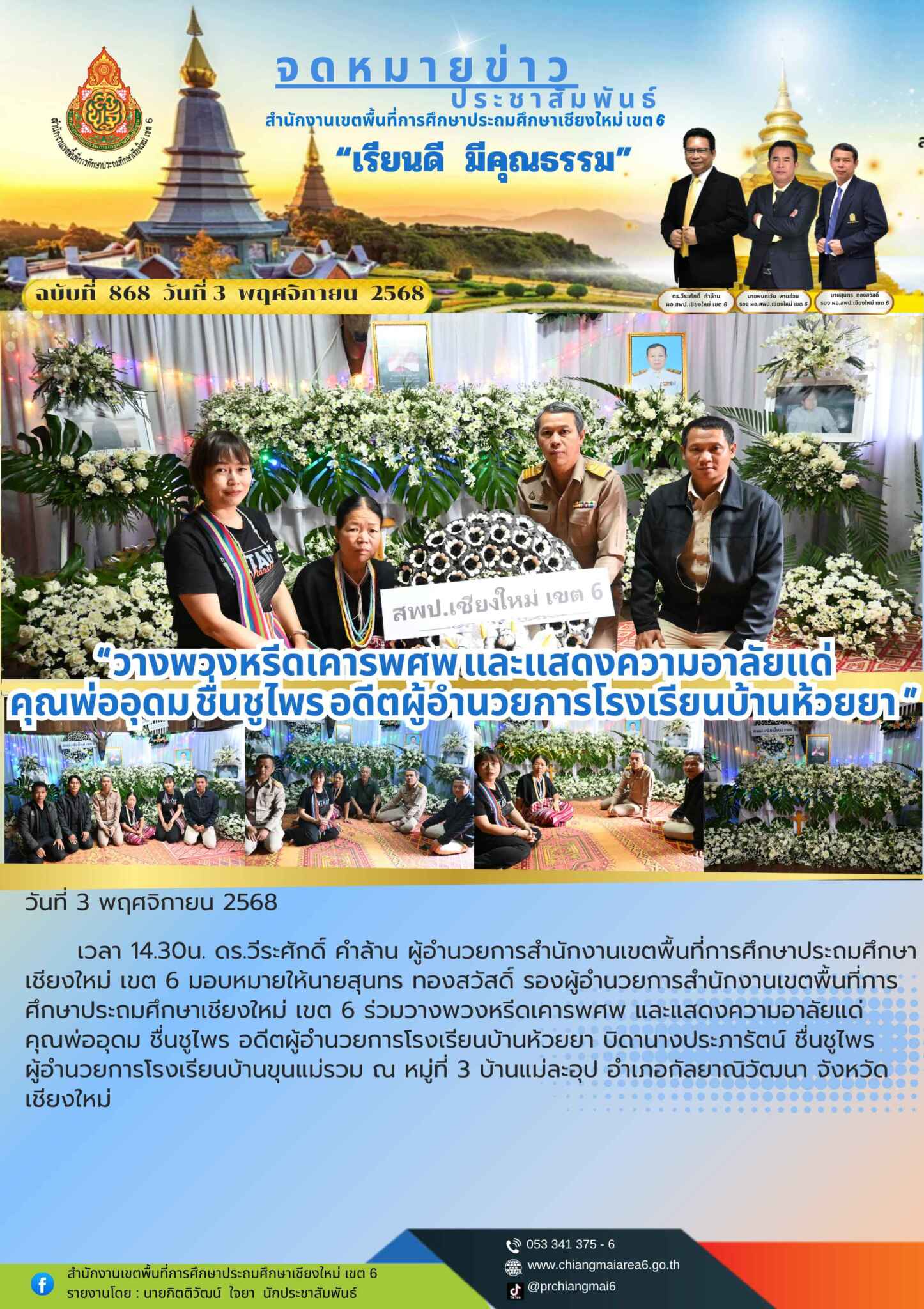 วันที่ 3 พฤศจิกายน 2568 เวลา14.30น. ดร.วีระศักดิ์ คำล้าน ผอ.สพป เชียงใหม่ เขต 6 มอบหมายให้นายสุนทร ทองสวัสดิ์ รองผอ. สพป.เชียงใหม่ เขต 6 ร่วมวางพวงหรีดเคารพศพ และแสดงความอาลัยแด่คุณพ่ออุดม ชื่นชูไพร อดีตผู้อำนวยการโรงเรียนบ้านห้วยยา บิดานางประภารัตน์ ชื่นชูไพร ผอ.โรงเรียนบ้านขุนแม่รวม ณ หมู่ที่ 3 บ้านแม่ละอุป อ.กัลยาณิวัฒนา จ.เชียงใหม่